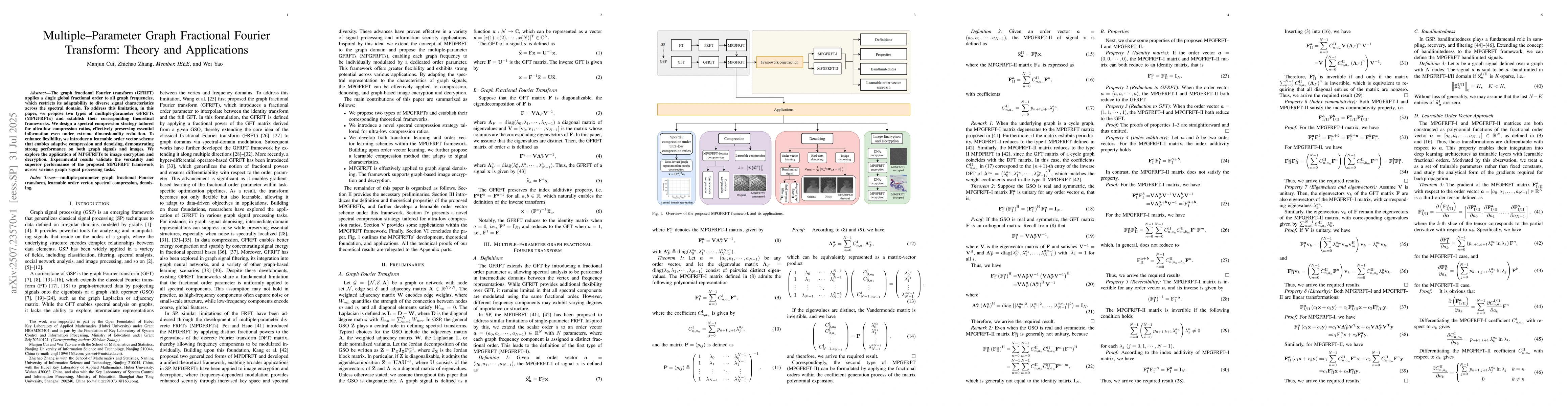 The graph fractional Fourier transform (GFRFT) applies a single global fractional order to all graph frequencies, which restricts its adaptability to diverse signal characteristics across the spectral domain. To address this limitation, in this paper, we propose two types of multiple-parameter GFRFTs (MPGFRFTs) and establish their corresponding theoretical frameworks. We design a spectral compression strategy tailored for ultra-low compression ratios, effectively preserving essential information even under extreme dimensionality reduction. To enhance flexibility, we introduce a learnable order vector scheme that enables adaptive compression and denoising, demonstrating strong performance on both graph signals and images. We explore the application of MPGFRFTs to image encryption and decryption. Experimental results validate the versatility and superior performance of the proposed MPGFRFT framework across various graph signal processing tasks.