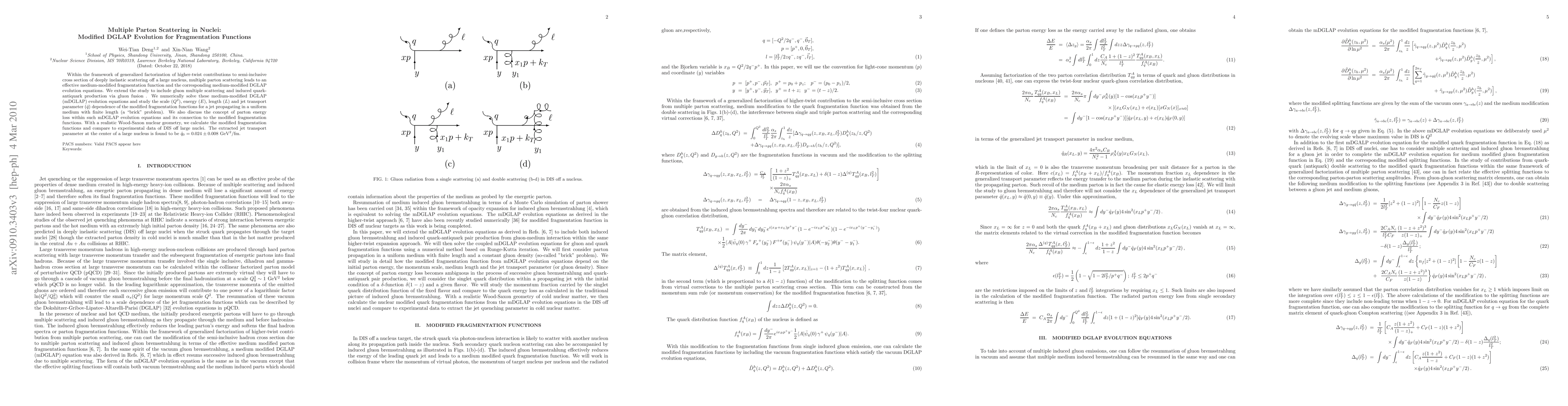 This paper investigates the modified DGLAP evolution equations for fragmentation functions due to multiple parton scattering in large nuclei, incorporating gluon interactions and quark-antiquark production. The study finds a jet transport parameter $\hat q_{0}=0.024\pm0.008$ GeV$^{2}$/fm, which aligns with experimental data from deep inelastic scattering off large nuclei.