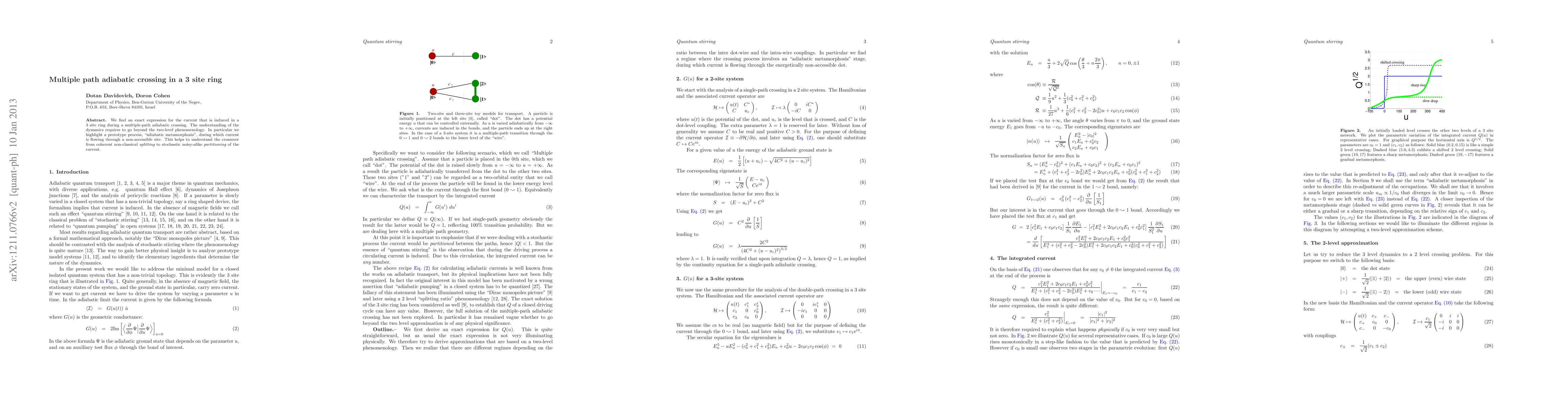 Researchers found an exact expression for current induced in a 3-site ring during multiple-path adiabatic crossing, revealing new insights into the dynamics and crossover from coherent to stochastic behavior.
