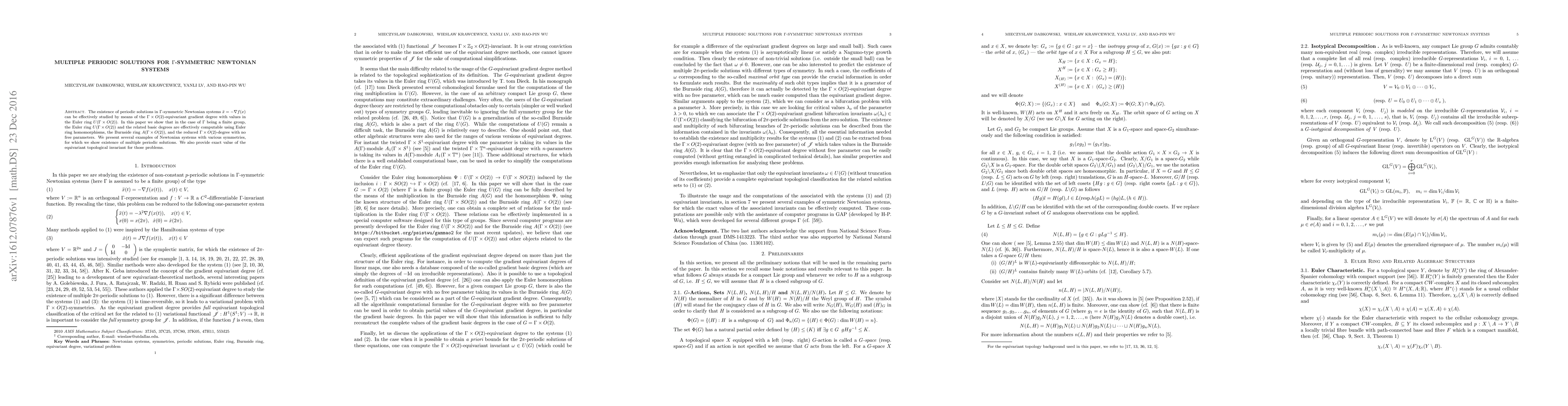 This paper investigates the existence of multiple periodic solutions in $\Gamma$-symmetric Newtonian systems using $(\Gamma\times O(2))$-equivariant gradient degree. It demonstrates the computability of the Euler ring and related degrees, providing examples of systems with multiple periodic solutions and their exact equivariant topological invariants.