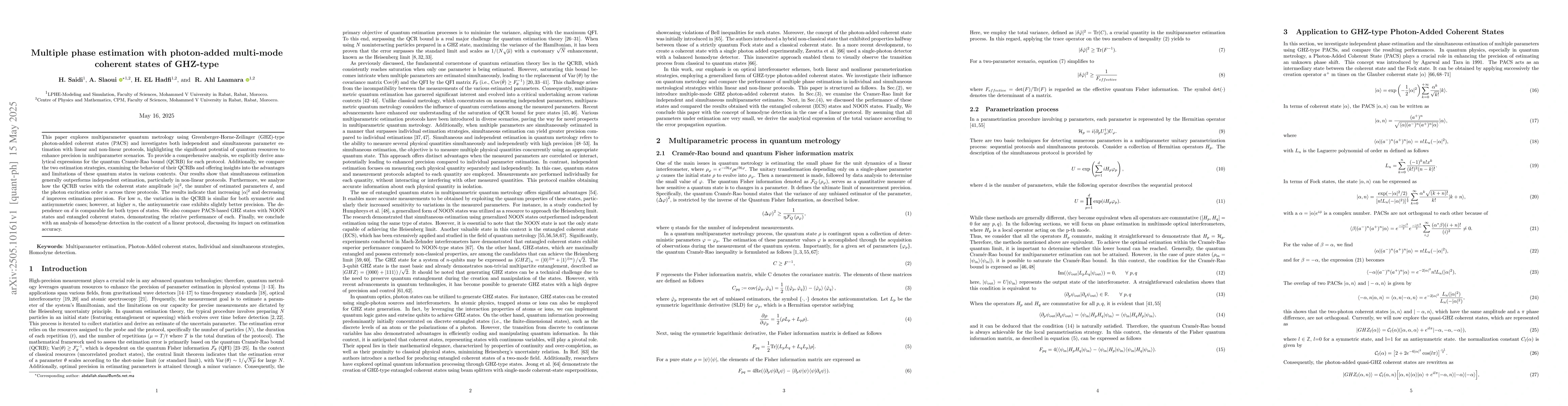 The research employs multiparameter quantum metrology using GHZ-type photon-added coherent states (PACS), deriving analytical expressions for the quantum Cram'er-Rao bound (QCRB) for various linear and non-linear protocols. It compares simultaneous and independent estimation strategies, analyzing the QCRB's dependence on coherent state amplitude, number of parameters, and photon excitation order.