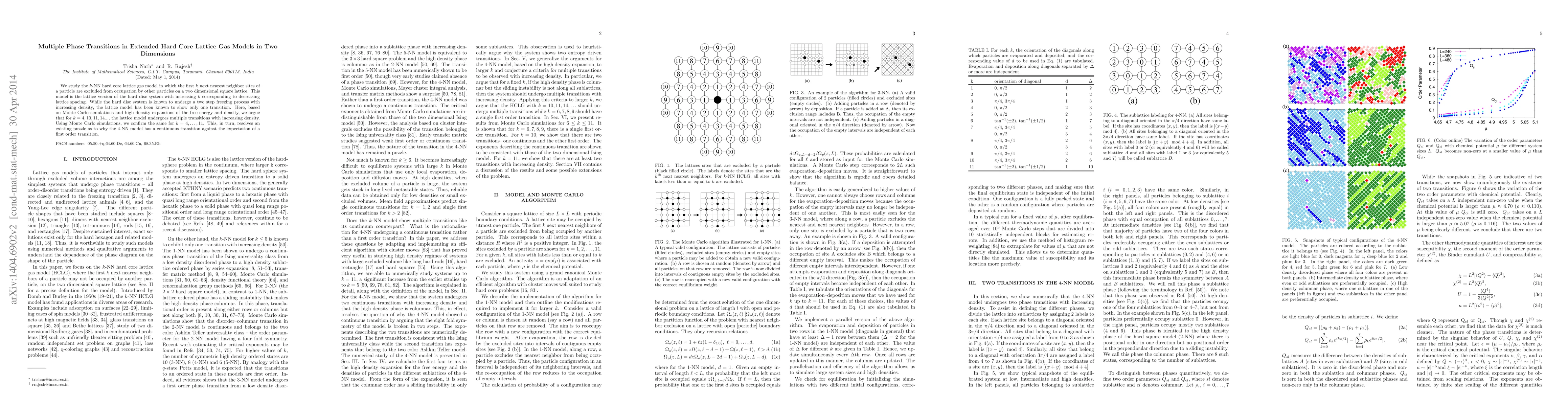 This paper investigates the $k$-nearest neighbor hard core lattice gas model in two dimensions, revealing that for certain values of $k$, the model undergoes multiple phase transitions with increasing density, contrary to previous findings that suggested only one transition. Monte Carlo simulations confirm these multiple transitions for $k=4$ to $11$.