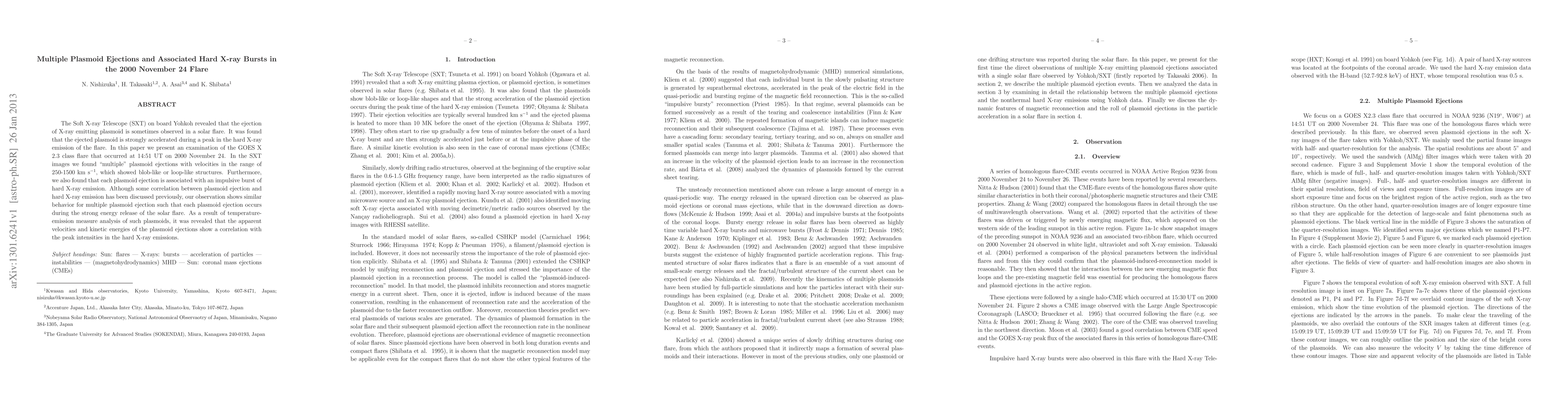 The Soft X-ray Telescope (SXT) on board Yohkoh revealed that the ejection of X-ray emitting plasmoid is sometimes observed in a solar flare. It was found that the ejected plasmoid is strongly accelerated during a peak in the hard X-ray emission of the flare. In this paper we present an examination of the GOES X 2.3 class flare that occurred at 14.51 UT on 2000 November 24. In the SXT images we found multiple plasmoid ejections with velocities in the range of 250-1500 km/s, which showed blob-like or loop-like structures. Furthermore, we also found that each plasmoid ejection is associated with an impulsive burst of hard X-ray emission. Although some correlation between plasmoid ejection and hard X-ray emission has been discussed previously, our observation shows similar behavior for multiple plasmoid ejection such that each plasmoid ejection occurs during the strong energy release of the solar flare. As a result of temperature-emission measure analysis of such plasmoids, it was revealed that the apparent velocities and kinetic energies of the plasmoid ejections show a correlation with the peak intensities in the hard X-ray emissions.