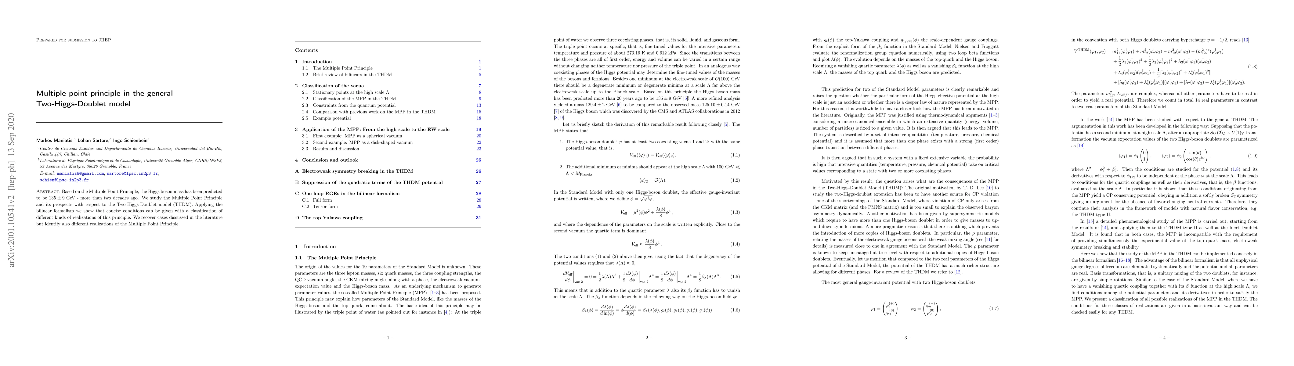 This paper explores the Multiple Point Principle in the Two-Higgs-Doublet model (THDM) and predicts the Higgs boson mass around 135 ± 9 GeV. It classifies various realizations of this principle using the bilinear formalism, identifying both known and novel scenarios.