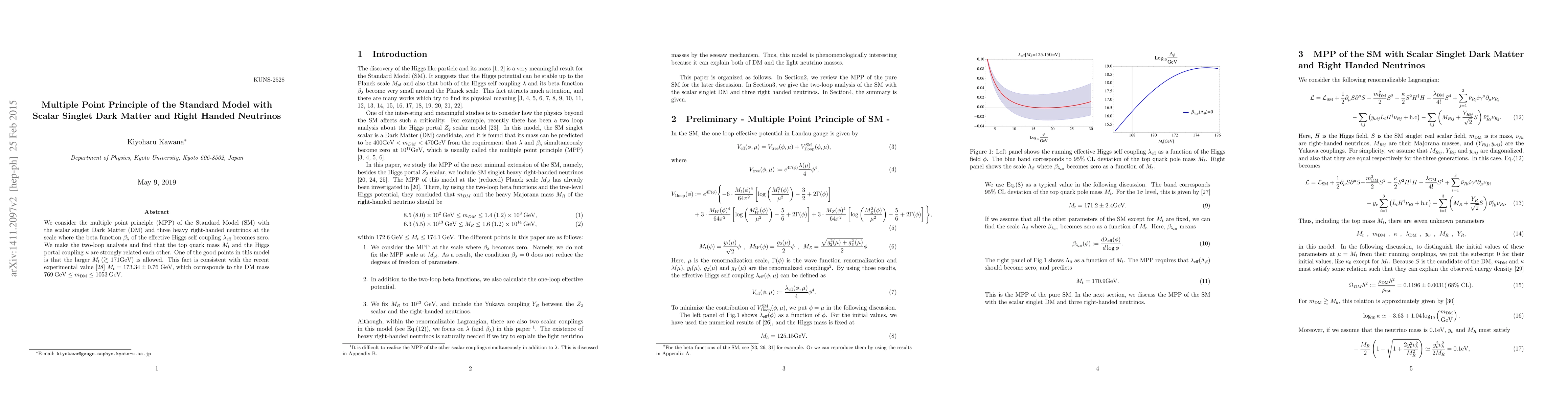 We consider the multiple point principle (MPP) of the Standard Model (SM) with the scalar singlet Dark Matter (DM) and three heavy right-handed neutrinos at the scale where the beta function $\beta_{\lambda}$ of the effective Higgs self coupling $\lambda_{\text{eff}}$ becomes zero. We make the two-loop analysis and find that the top quark mass $M_{t}$ and the Higgs portal coupling $\kappa$ are strongly related each other. One of the good points in this model is that the larger $M_{t}{1mm}(\gtrsim 171\text{GeV})$ is allowed. This fact is consistent with the recent experimental value \cite{ATLAS:2014wva} $M_{t}=173.34\pm0.76$ GeV, which corresponds to the DM mass $769{1mm}\text{GeV}\leq m_{\text{DM}}\leq 1053 {1mm}\text{GeV}$.