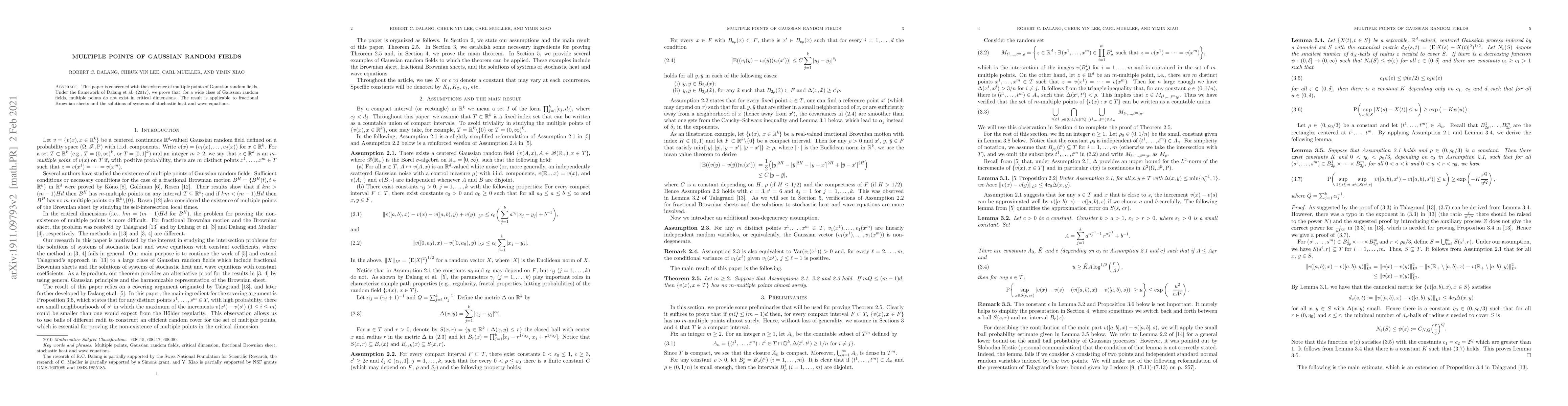 This paper proves the non-existence of multiple points in Gaussian random fields for critical dimensions, extending the findings to fractional Brownian sheets and solutions of stochastic heat and wave equations. The result is grounded in the framework established by Dalang et al. (2017).