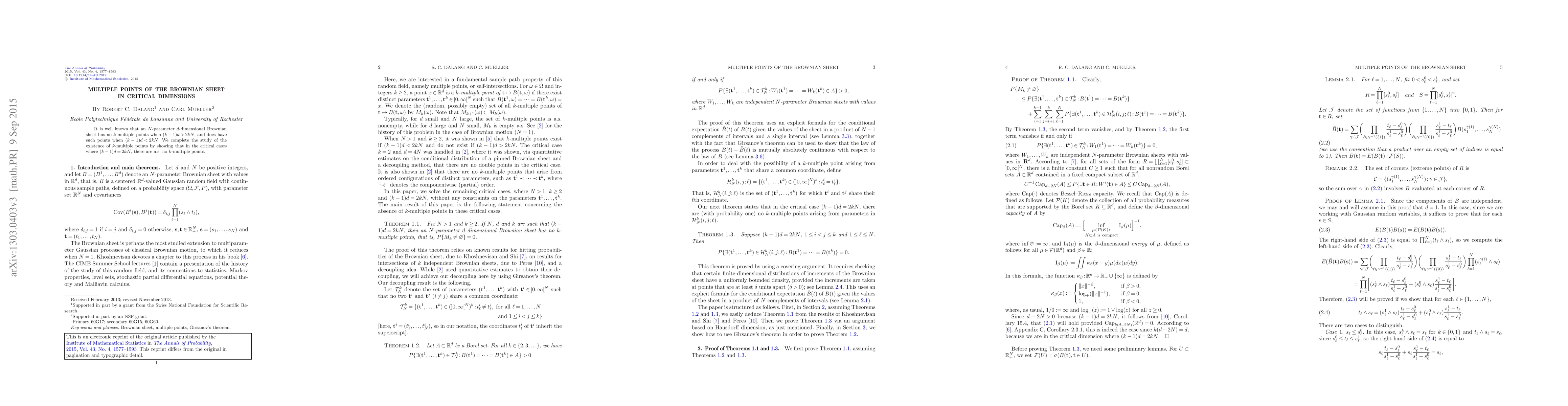 This paper investigates the existence of $k$-multiple points in an $N$-parameter $d$-dimensional Brownian sheet, confirming that no $k$-multiple points exist when $(k-1)d=2kN$, thus completing the study of critical cases.