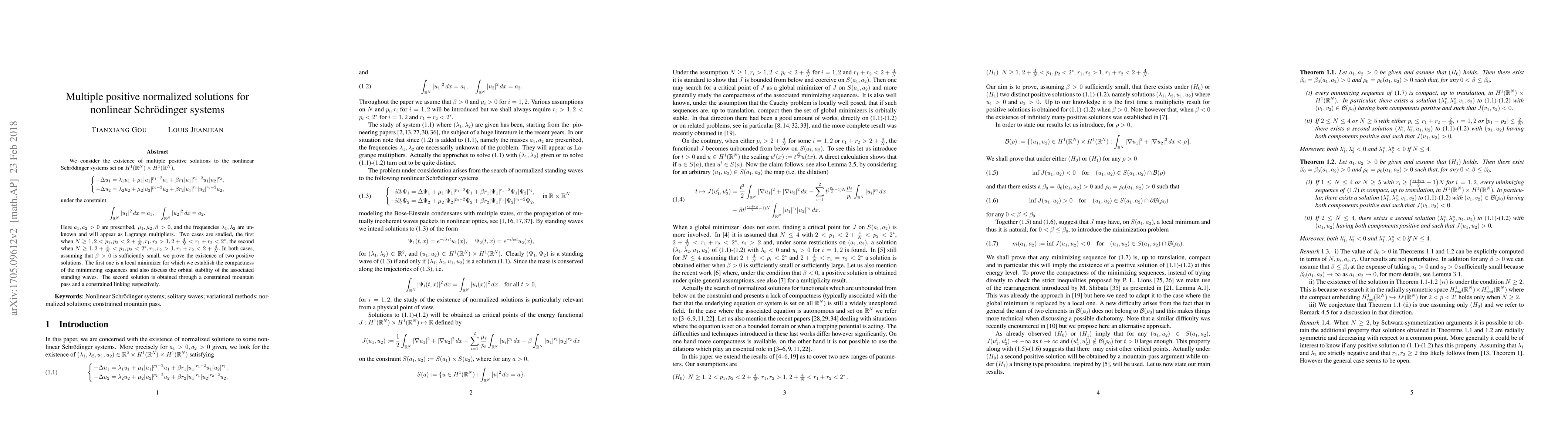 We consider the existence of multiple positive solutions to the nonlinear Schr\"odinger systems sets on $H^1(\mathbb{R}^N) \times H^1(\mathbb{R}^N)$, \[ \left\{ \begin{aligned} -\Delta u_1 &= \lambda_1 u_1 + \mu_1 |u_1|^{p_1 -2}u_1 + \beta r_1 |u_1|^{r_1-2} u_1|u_2|^{r_2}, -\Delta u_2 &= \lambda_2 u_2 + \mu_2 |u_2|^{p_2 -2}u_2 + \beta r_2 |u_1|^{r_1} |u_2|^{r_2 -2} u_2, \end{aligned} \right. \] under the constraint \[ \int_{\mathbb{R}^N}|u_1|^2 \, dx = a_1,\quad \int_{\mathbb{R}^N}|u_2|^2 \, dx = a_2. \] Here $a_1, a_2 >0$ are prescribed, $\mu_1, \mu_2, \beta>0$, and the frequencies $\lambda_1, \lambda_2$ are unknown and will appear as Lagrange multipliers. Two cases are studied, the first when $N \geq 1, 2 < p_1, p_2 < 2 + \frac 4N, r_1, r_2 > 1, 2 + \frac 4N < r_1 + r_2 < 2^*$, the second when $ N \geq 1, 2+ \frac 4N < p_1, p_2 < 2^*, r_1, r_2 > 1, r_1 + r_2 < 2 + \frac 4N.$ In both cases, assuming that $\beta >0$ is sufficiently small, we prove the existence of two positive solutions. The first one is a local minimizer for which we establish the compactness of the minimizing sequences and also discuss the orbital stability of the associated standing waves. The second solution is obtained through a constrained mountain pass and a constrained linking respectively.