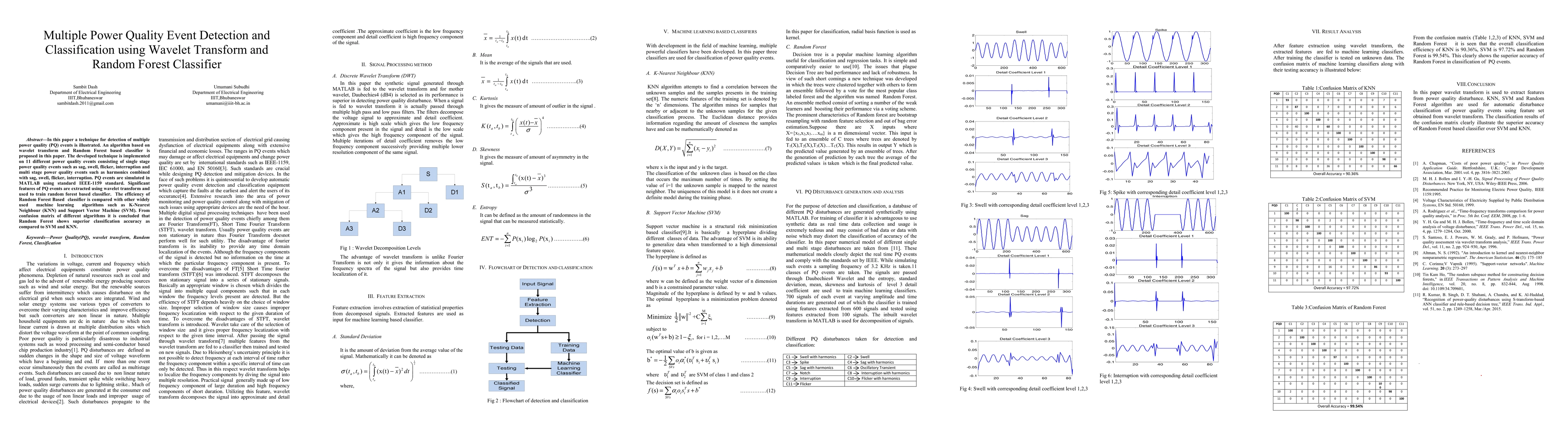 This paper proposes a wavelet transform and Random Forest classifier-based technique for detecting multiple power quality events. The method outperforms KNN and SVM in classifying 11 different power quality events, as shown by higher classification accuracy in the confusion matrix.