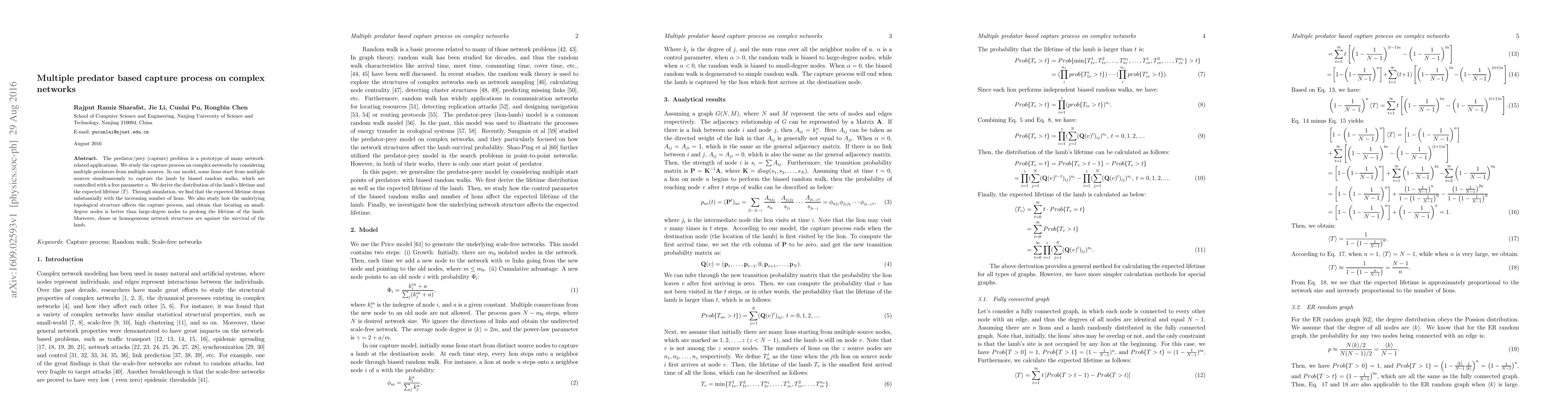 The predator/prey (capture) problem is a prototype of many network-related applications. We study the capture process on complex networks by considering multiple predators from multiple sources. In our model, some lions start from multiple sources simultaneously to capture the lamb by biased random walks, which are controlled with a free parameter $\alpha$. We derive the distribution of the lamb's lifetime and the expected lifetime $\left\langle T\right\rangle $. Through simulation, we find that the expected lifetime drops substantially with the increasing number of lions. We also study how the underlying topological structure affects the capture process, and obtain that locating on small-degree nodes is better than large-degree nodes to prolong the lifetime of the lamb. Moreover, dense or homogeneous network structures are against the survival of the lamb.
