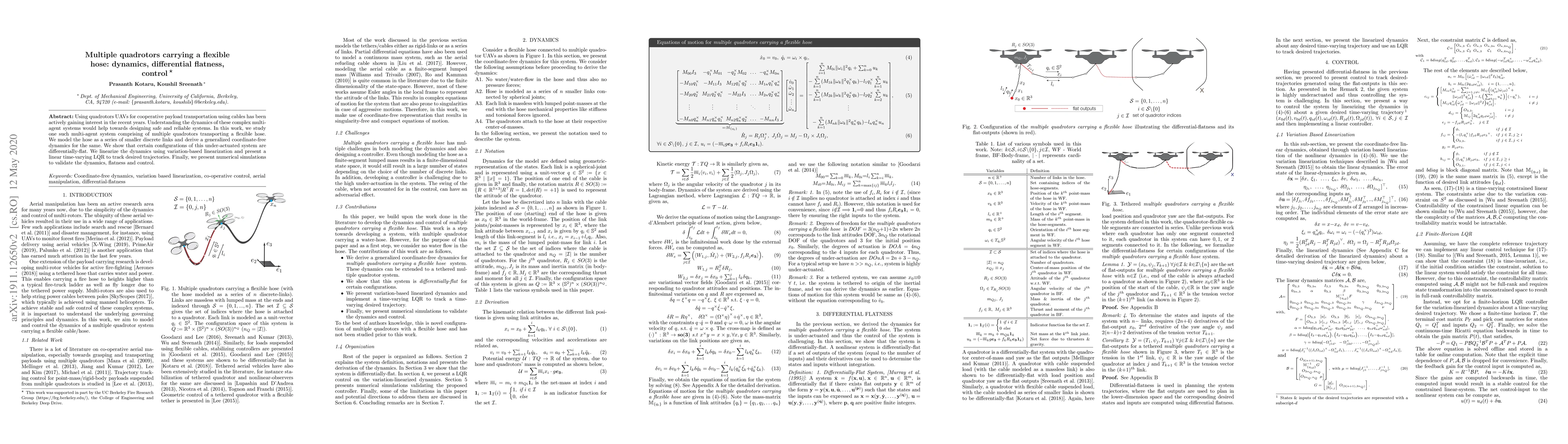 Researchers studied dynamics of multiple quadrotors carrying a flexible hose, finding certain configurations are differentially-flat and presenting linear control methods to track desired trajectories.