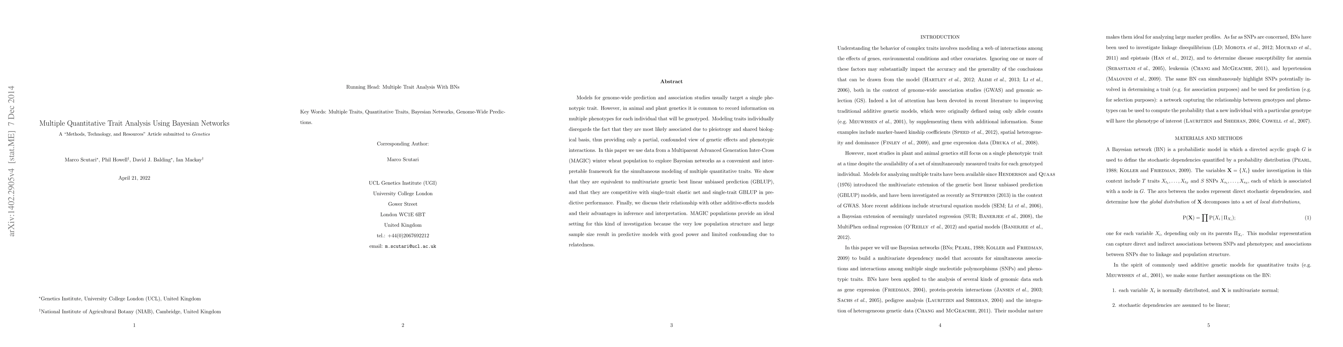 This paper investigates the use of Bayesian networks for modeling multiple quantitative traits simultaneously in genome-wide prediction studies, demonstrating their predictive performance and interpretability compared to traditional single-trait methods, using a Multiparent Advanced Generation Inter-Cross winter wheat population as a case study.