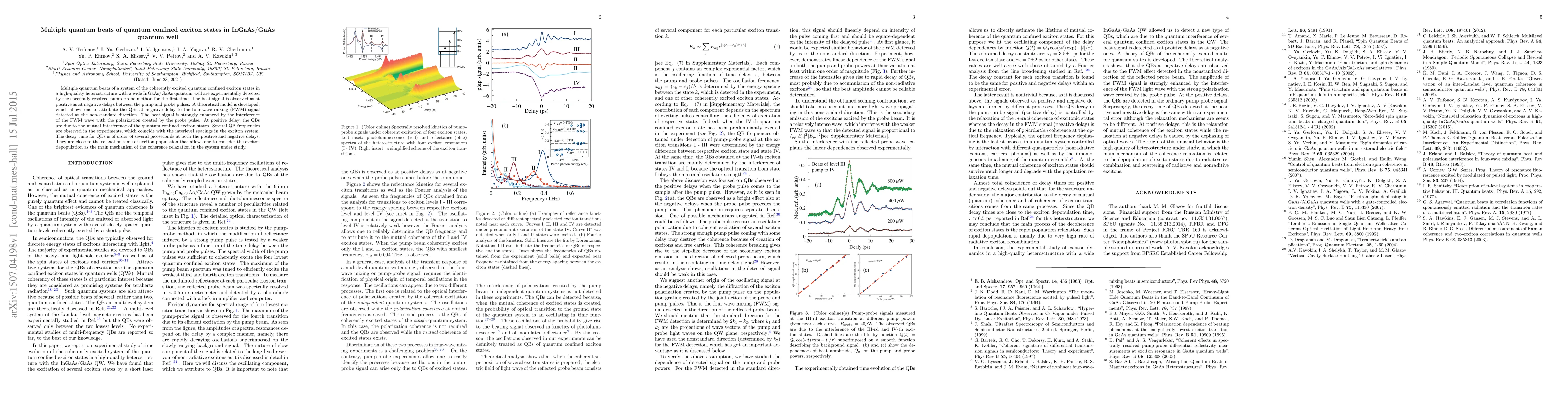 Multiple quantum beats of a system of the coherently excited quantum confined exciton states in a high-quality heterostructure with a wide InGaAs/GaAs quantum well are experimentally detected by the spectrally resolved pump-probe method for the first time. The beat signal is observed as at positive as at negative delays between the pump and probe pulses. A theoretical model is developed, which allows one to attribute the QBs at negative delay to the four-wave mixing (FWM) signal detected at the non-standard direction. The beat signal is strongly enhanced by the interference of the FWM wave with the polarization created by the probe pulse. At positive delay, the QBs are due to the mutual interference of the quantum confined exciton states. Several QB frequencies are observed in the experiments, which coincide with the interlevel spacings in the exciton system. The decay time for QBs is of order of several picoseconds at both the positive and negative delays. They are close to the relaxation time of exciton population that allows one to consider the exciton depopulation as the main mechanism of the coherence relaxation in the system under study.