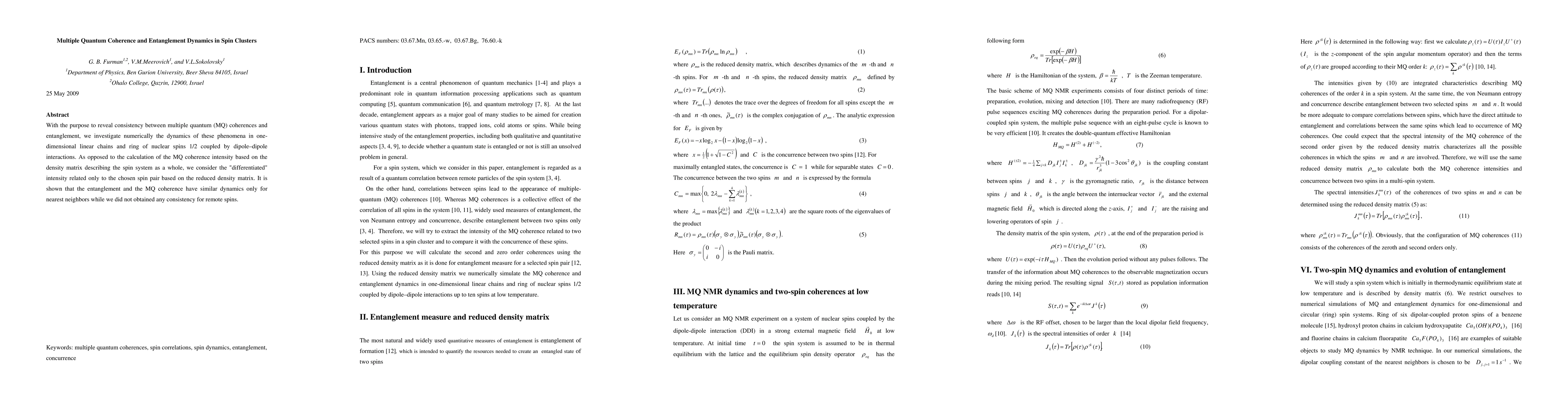 This paper numerically investigates the dynamics of multiple quantum coherence and entanglement in spin clusters, finding that coherence and entanglement exhibit similar dynamics only for nearest-neighbor spins, with no consistency observed for distant spins.