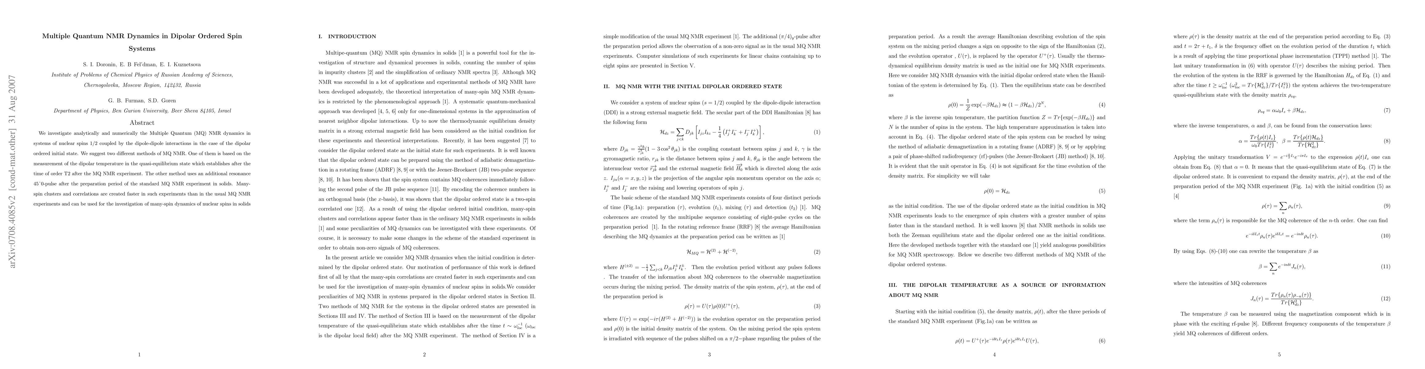 This paper explores the dynamics of Multiple Quantum (MQ) NMR in nuclear spin systems coupled by dipole-dipole interactions, particularly in dipolar ordered initial states. It proposes two MQ NMR methods, one measuring dipolar temperature in quasi-equilibrium and another using a 45°-pulse, both enhancing many-spin dynamics for solid-state investigations.