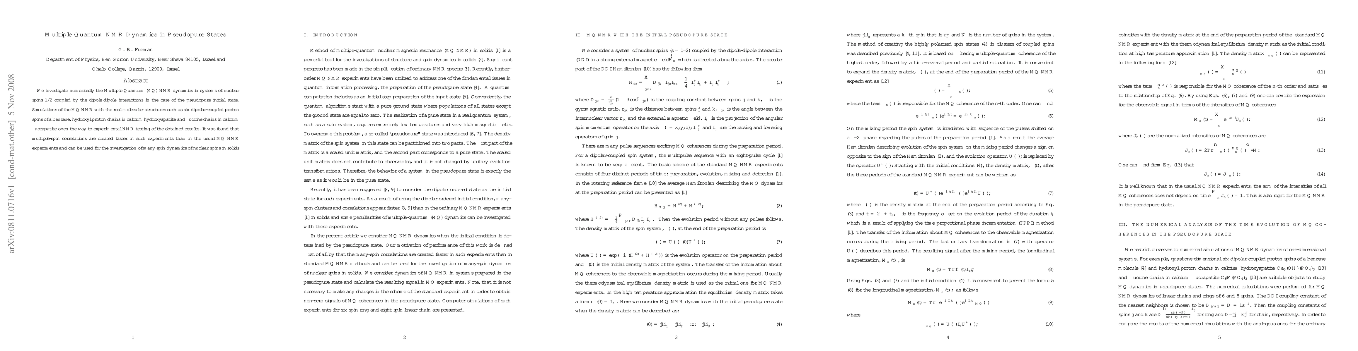 This paper numerically investigates the dynamics of Multiple Quantum (MQ) NMR in systems of coupled nuclear spins 1/2, particularly in pseudopure states. The study reveals that MQ NMR in real molecular structures, such as benzene and hydroxyapatite, creates multiple-spin correlations faster than typical MQ NMR, offering a new approach for studying many-spin dynamics in solids.