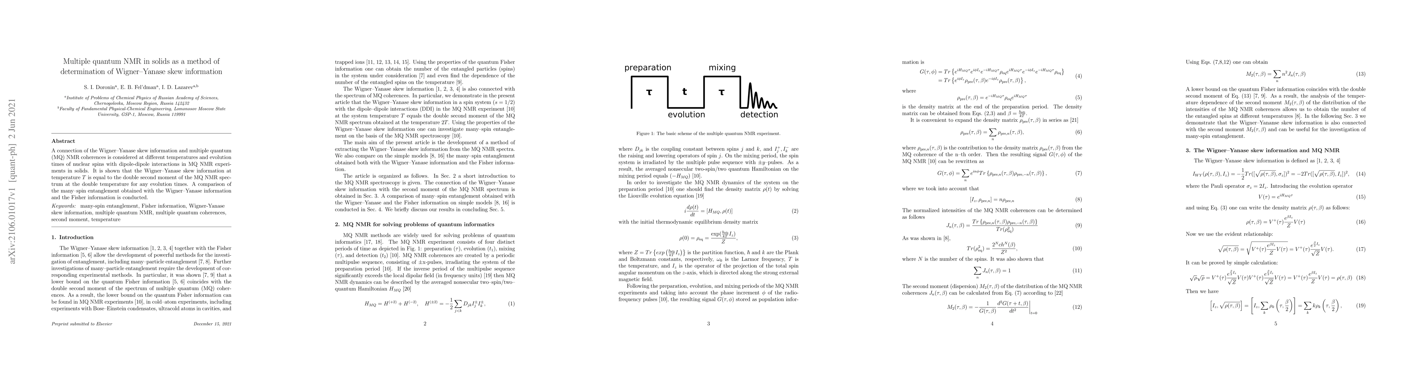 This paper explores the relationship between Wigner-Yanase skew information and multiple quantum NMR coherences in solids, demonstrating that the former equals the double second moment of the MQ NMR spectrum at double the temperature, regardless of evolution times. It also compares many-spin entanglement derived from Wigner-Yanase information with Fisher information.