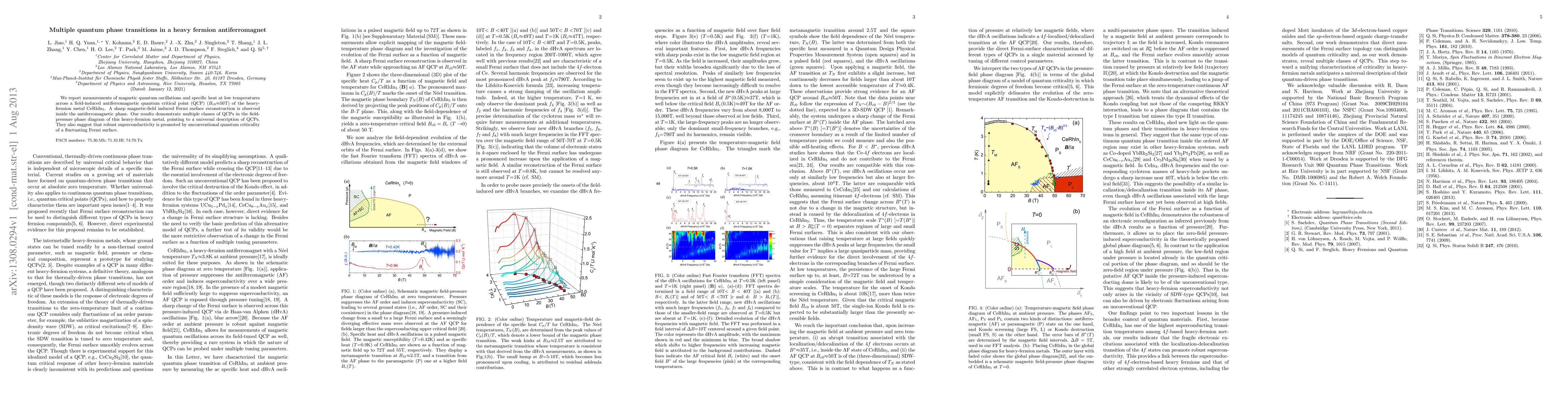 This paper investigates magnetic quantum oscillations and specific heat in the heavy-fermion metal CeRhIn_5, revealing multiple quantum phase transitions at a field-induced antiferromagnetic quantum critical point. The study highlights a sharp Fermi surface reconstruction and suggests a universal description of quantum critical points, with implications for promoting superconductivity.