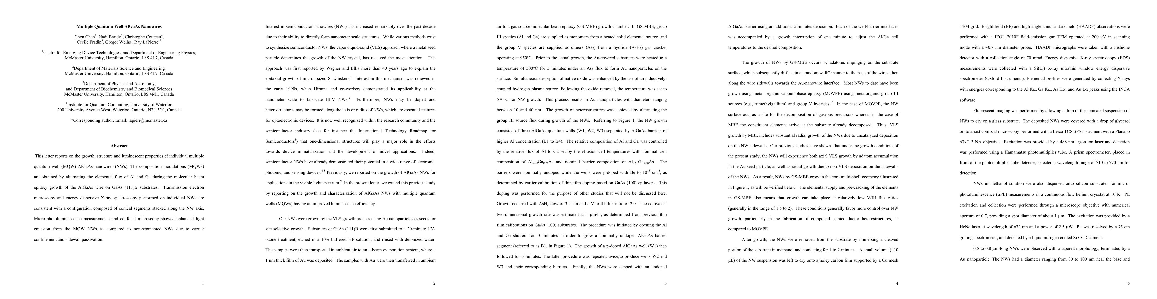 This study investigates the growth and luminescent properties of AlGaAs nanowires with multiple quantum wells, revealing enhanced light emission due to carrier confinement and sidewall passivation, as confirmed by transmission electron microscopy and micro-photoluminescence measurements.