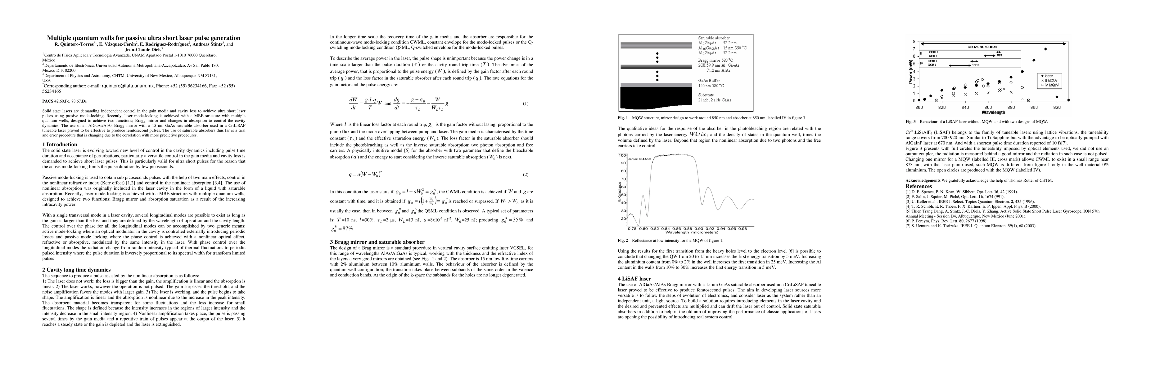 Summary: This paper discusses the use of multiple quantum wells in solid-state lasers for generating ultra-short laser pulses through passive mode-locking. An AlGaAs/AlAs Bragg mirror with a 15 nm GaAs saturable absorber in a Cr:LiSAF laser effectively produces femtosecond pulses, illustrating a shift from trial-and-error to more predictive methods in saturable absorber design.