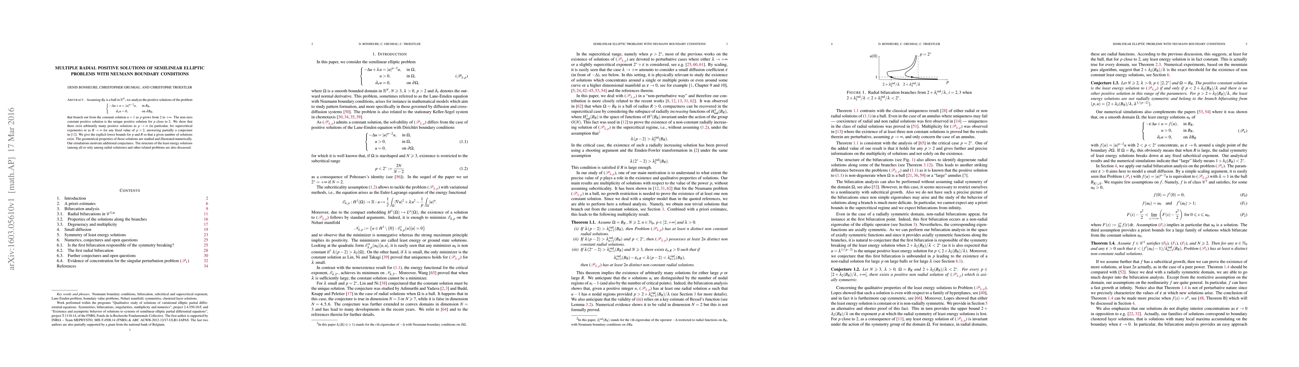 This paper investigates the existence of multiple radial positive solutions for a semilinear elliptic problem with Neumann boundary conditions, showing that as parameters $p$ or $R$ increase, numerous solutions branch out from the constant solution $u=1$. The study provides explicit lower bounds for $p$ and $R$ to ensure a given number of solutions and explores their geometrical properties.