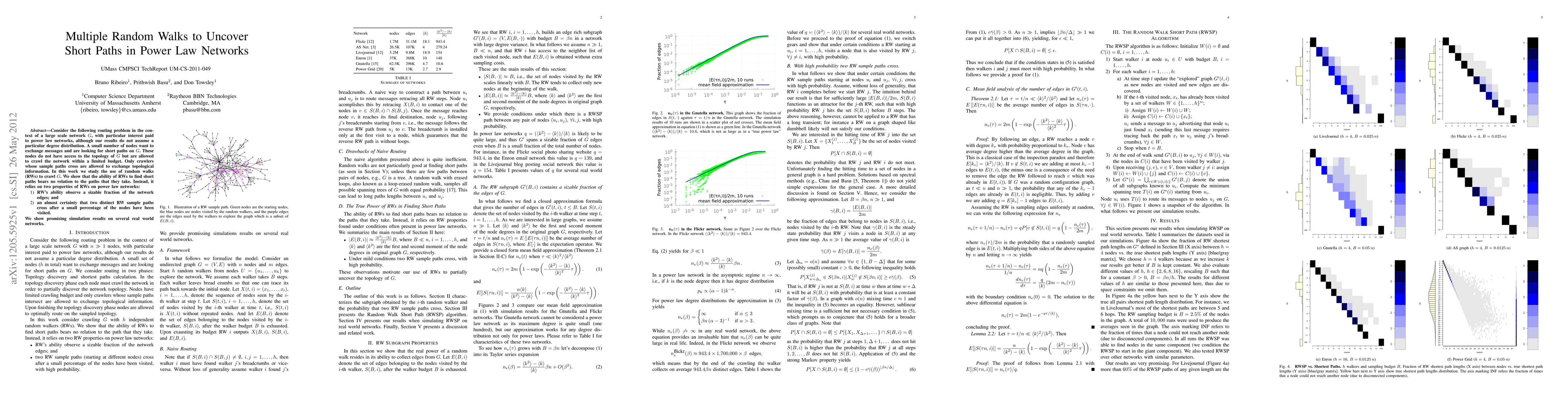 Consider the following routing problem in the context of a large scale network $G$, with particular interest paid to power law networks, although our results do not assume a particular degree distribution. A small number of nodes want to exchange messages and are looking for short paths on $G$. These nodes do not have access to the topology of $G$ but are allowed to crawl the network within a limited budget. Only crawlers whose sample paths cross are allowed to exchange topological information. In this work we study the use of random walks (RWs) to crawl $G$. We show that the ability of RWs to find short paths bears no relation to the paths that they take. Instead, it relies on two properties of RWs on power law networks: 1) RW's ability observe a sizable fraction of the network edges; and 2) an almost certainty that two distinct RW sample paths cross after a small percentage of the nodes have been visited. We show promising simulation results on several real world networks.