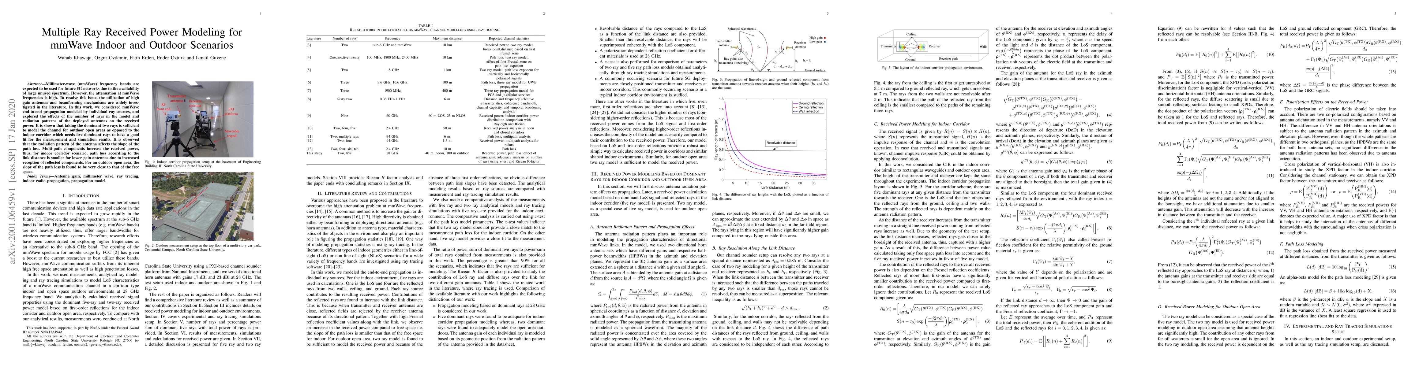 This research examines mmWave propagation for 5G networks, finding that two dominant rays model outdoor areas, while five are needed for indoor corridors. Antenna radiation patterns impact path loss, with lower gain antennas showing smaller path loss indoors due to better reflected component reception.