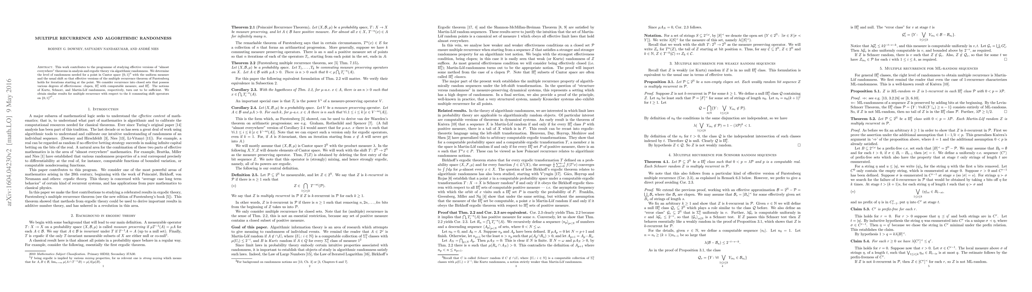 This work contributes to the programme of studying effective versions of "almost everywhere" theorems in analysis and ergodic theory via algorithmic randomness. We determine the level of randomness needed for a point in a Cantor space $ \{0,1\}^{\NN}$ with the uniform measure and the usual shift so that effective versions of the multiple recurrence theorem of Furstenberg holds for iterations starting at the point. We consider recurrence into closed sets that possess various degrees of effectiveness: clopen, $\PPI$ with computable measure, and $\PPI$. The notions of Kurtz, Schnorr, and \ML\ randomness, respectively, turn out to be sufficient. We obtain similar results for multiple recurrence with respect to the $k$ commuting shift operators on $\{0,1\}^{\NN^{\normalsize k}}$.
