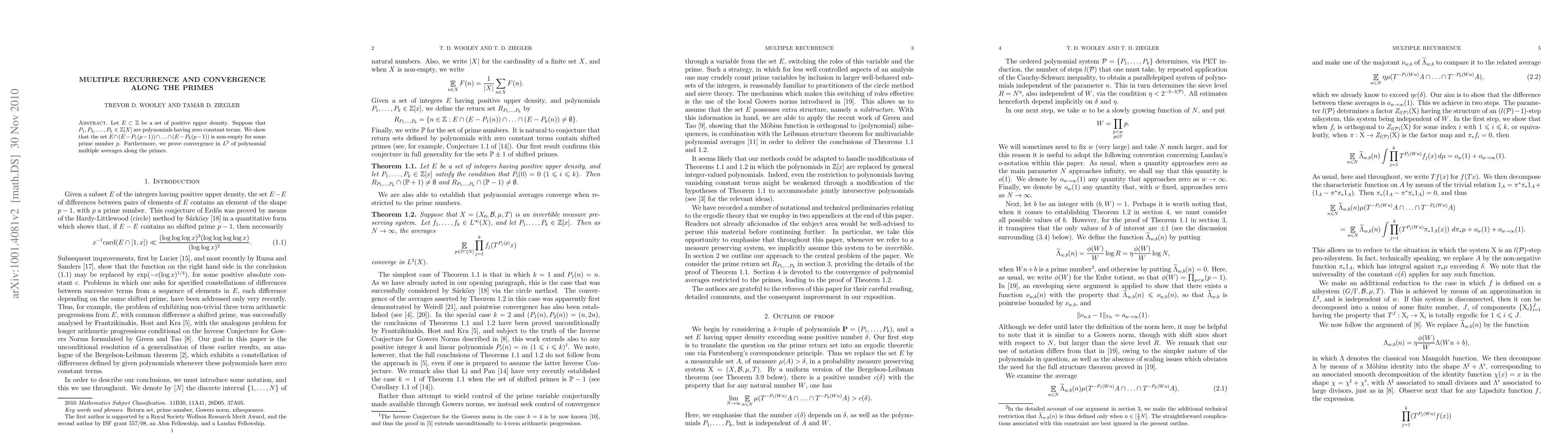 The paper demonstrates that a set of positive upper density intersects non-trivially with translated versions of itself by specific polynomials evaluated at prime numbers minus one. Additionally, it establishes convergence in $L^2$ for polynomial averages along primes.