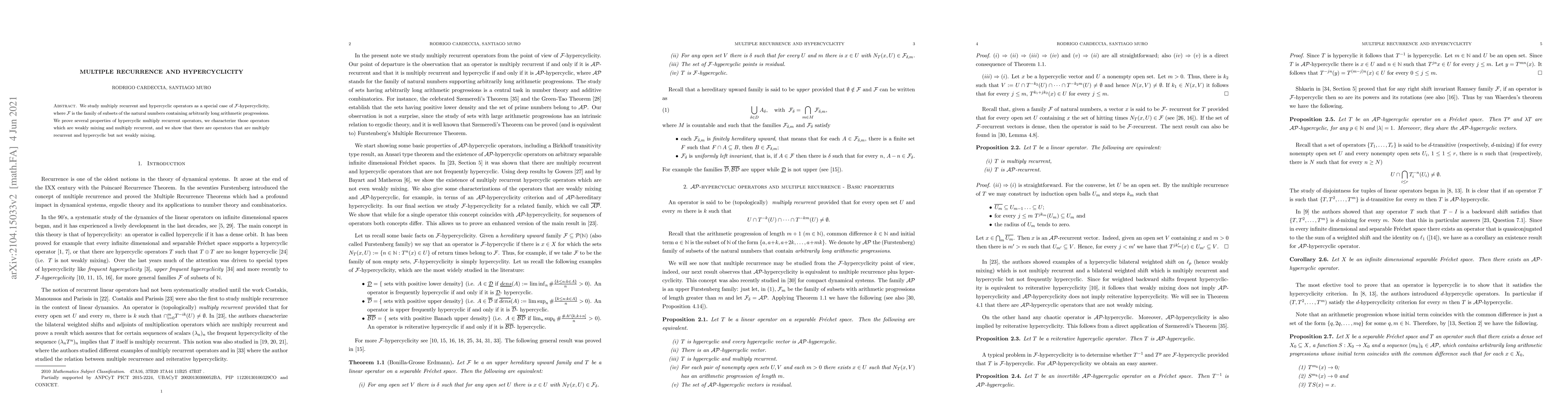 We study multiply recurrent and hypercyclic operators as a special case of $\mathcal F$-hypercyclicity, where $\mathcal F$ is the family of subsets of the natural numbers containing arbitrarily long arithmetic progressions. We prove several properties of hypercyclic multiply recurrent operators, we characterize those operators which are weakly mixing and multiply recurrent, and we show that there are operators that are multiply recurrent and hypercyclic but not weakly mixing.