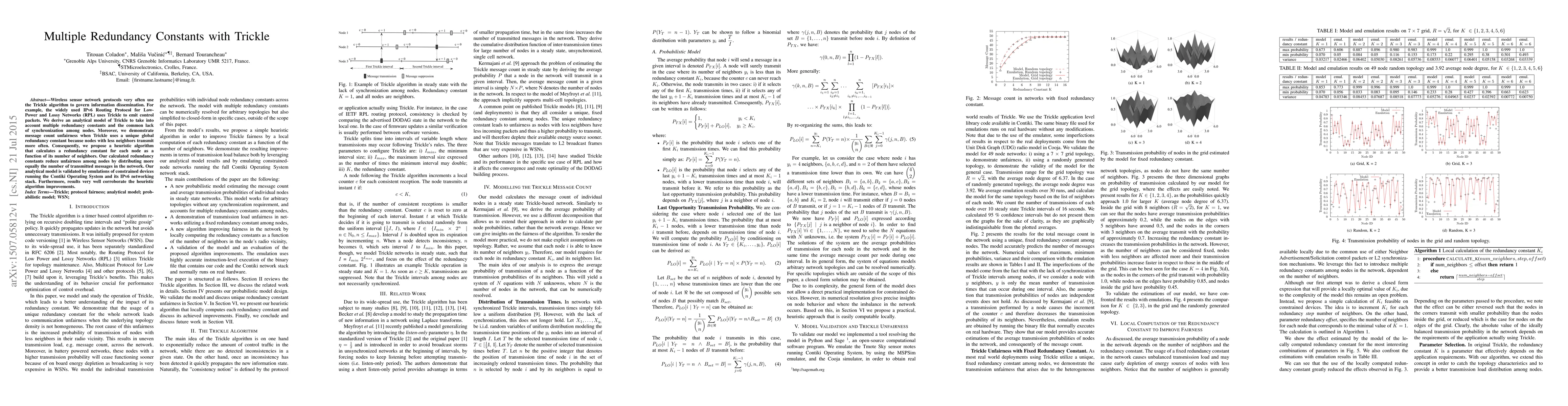 Wireless sensor network protocols very often use the Trickle algorithm to govern information dissemination. For example, the widely used IPv6 Routing Protocol for Low-Power and Lossy Networks (RPL) uses Trickle to emit control packets. We derive an analytical model of Trickle to take into account multiple redundancy constants and the common lack of synchronization among nodes. Moreover, we demonstrate message count unfairness when Trickle uses a unique global redundancy constant because nodes with less neighbors transmit more often. Consequently, we propose a heuristic algorithm that calculates a redundancy constant for each node as a function of its number of neighbors. Our calculated redundancy constants reduce unfairness among nodes by distributing more equally the number of transmitted messages in the network. Our analytical model is validated by emulations of constrained devices running the Contiki Operating System and its IPv6 networking stack. Furthermore, results very well corroborate the heuristic algorithm improvements.