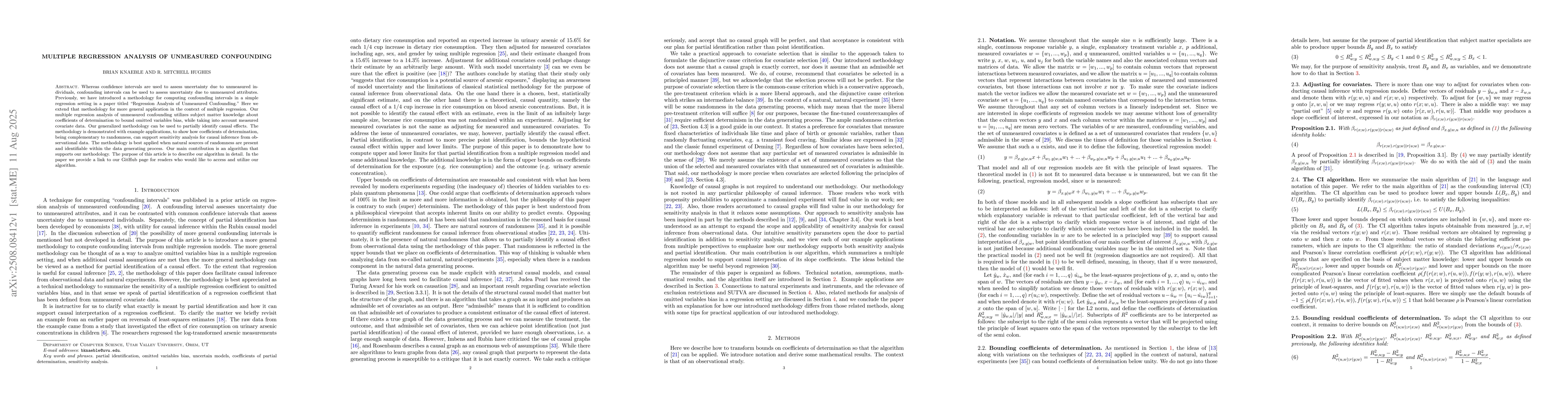 Whereas confidence intervals are used to assess uncertainty due to unmeasured individuals, confounding intervals can be used to assess uncertainty due to unmeasured attributes. Previously, we have introduced a methodology for computing confounding intervals in a simple regression setting in a paper titled ``Regression Analysis of Unmeasured Confounding." Here we extend that methodology for more general application in the context of multiple regression. Our multiple regression analysis of unmeasured confounding utilizes subject matter knowledge about coefficients of determination to bound omitted variables bias, while taking into account measured covariate data. Our generalized methodology can be used to partially identify causal effects. The methodology is demonstrated with example applications, to show how coefficients of determination, being complementary to randomness, can support sensitivity analysis for causal inference from observational data. The methodology is best applied when natural sources of randomness are present and identifiable within the data generating process. Our main contribution is an algorithm that supports our methodology. The purpose of this article is to describe our algorithm in detail. In the paper we provide a link to our GitHub page for readers who would like to access and utilize our algorithm.