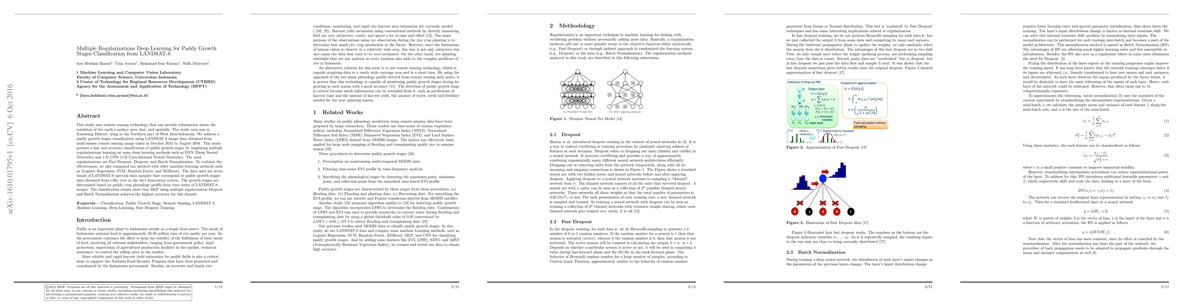 This study employs deep learning methods with multiple regularizations to classify paddy growth stages using LANDSAT-8 imagery from Karawang District, Indonesia. The best results were achieved by a Deep Neural Network with Dropout and Batch Normalization, outperforming traditional machine learning methods.