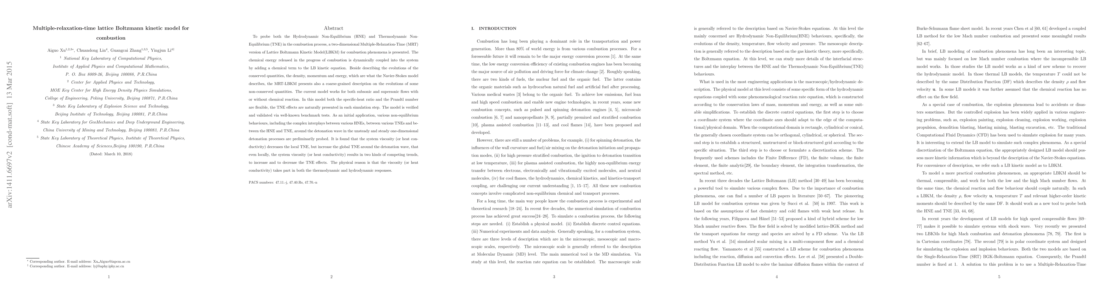 To probe both the Hydrodynamic Non-Equilibrium (HNE) and Thermodynamic Non-Equilibrium (TNE) in the combustion process, a two-dimensional Multiple-Relaxation-Time (MRT) version of Lattice Boltzmann Kinetic Model(LBKM) for combustion phenomena is presented. The chemical energy released in the progress of combustion is dynamically coupled into the system by adding a chemical term to the LB kinetic equation. Beside describing the evolutions of the conserved quantities, the density, momentum and energy, which are what the Navier-Stokes model describes, the MRT-LBKM presents also a coarse-grained description on the evolutions of some non-conserved quantities. The current model works for both subsonic and supersonic flows with or without chemical reaction. In this model both the specific-heat ratio and the Prandtl number are flexible, the TNE effects are naturally presented in each simulation step. The model is verified and validated via well-known benchmark tests. As an initial application, various non-equilibrium behaviours, including the complex interplays between various HNEs, between various TNEs and between the HNE and TNE, around the detonation wave in the unsteady and steady one-dimensional detonation processes are preliminarily probed. It is found that the system viscosity (or heat conductivity) decreases the local TNE, but increase the global TNE around the detonation wave, that even locally, the system viscosity (or heat conductivity) results in two kinds of competing trends, to increase and to decrease the TNE effects. The physical reason is that the viscosity (or heat conductivity) takes part in both the thermodynamic and hydrodynamic responses.