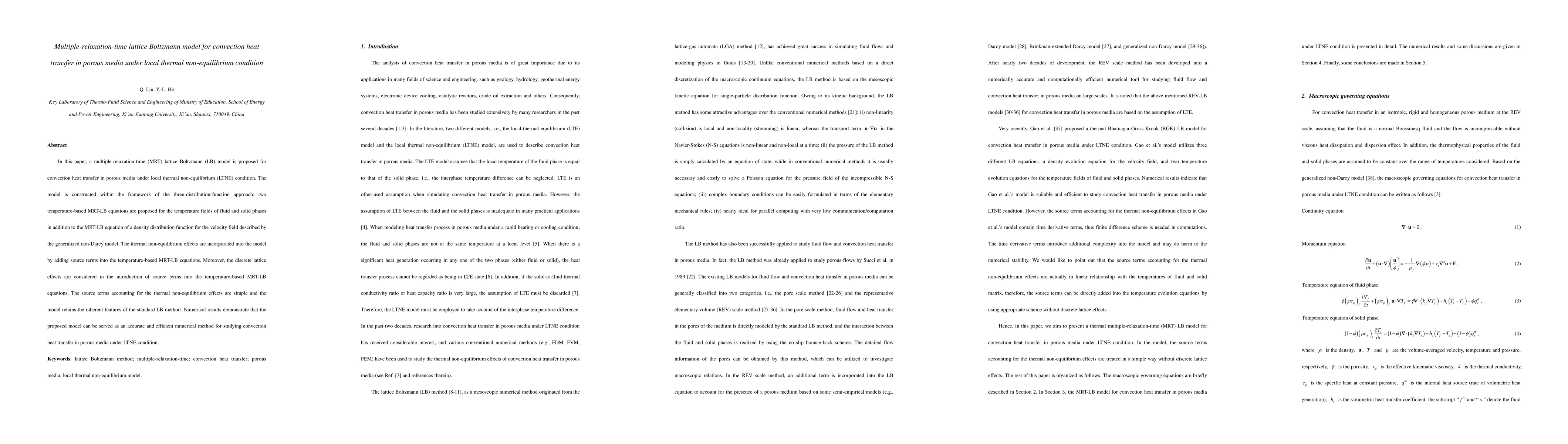 This paper proposes a multiple-relaxation-time lattice Boltzmann model for convection heat transfer in porous media under local thermal non-equilibrium conditions. The model incorporates thermal non-equilibrium effects through source terms in the MRT-LB equations, demonstrating accuracy and efficiency in numerical simulations.