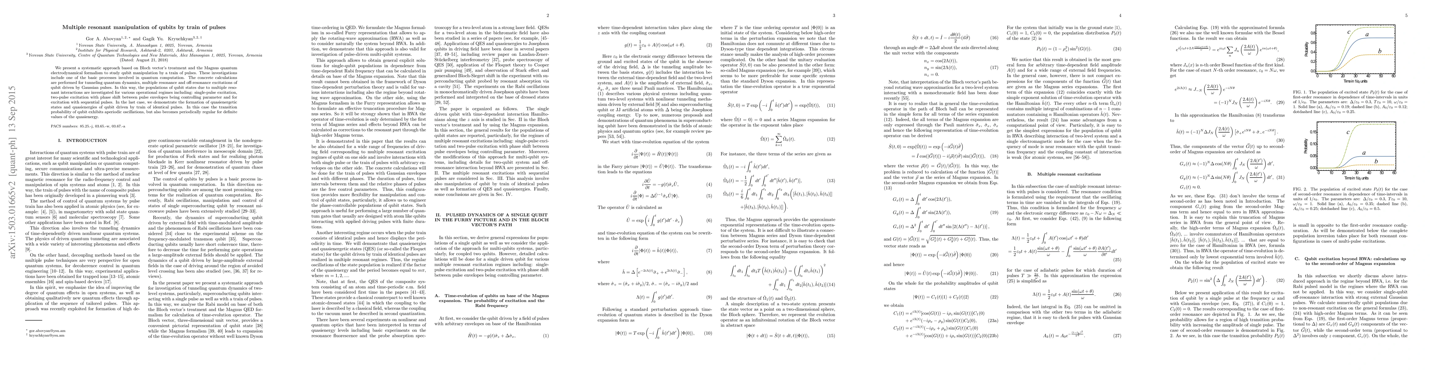 This paper explores the manipulation of qubits using a train of pulses through systematic calculations based on Bloch vector treatment and the Magnus quantum electrodynamical formalism. It investigates multiple resonant interactions and quasienergetic states, demonstrating periodic regularities in transition probabilities for certain quasienergy values.