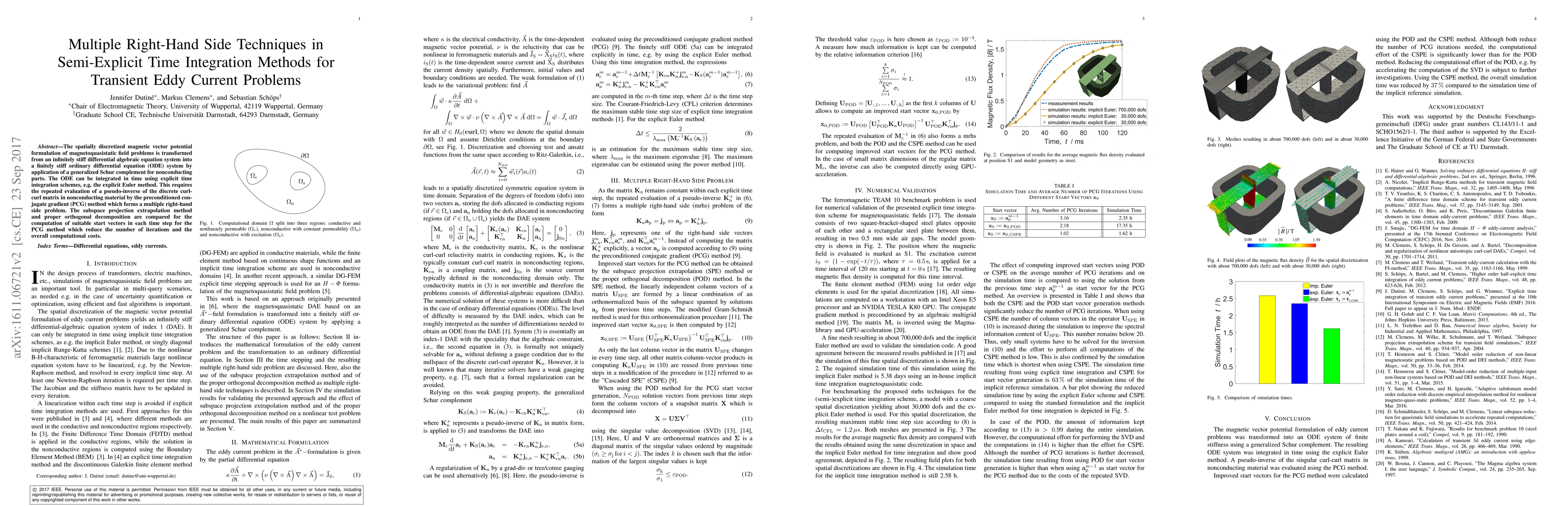 This paper explores the transformation of magnetoquasistatic field problems into a finitely stiff ODE system using a generalized Schur complement. It investigates multiple right-hand side techniques for efficient explicit time integration, comparing the subspace projection extrapolation method and proper orthogonal decomposition to reduce computational costs in the preconditioned conjugate gradient method.