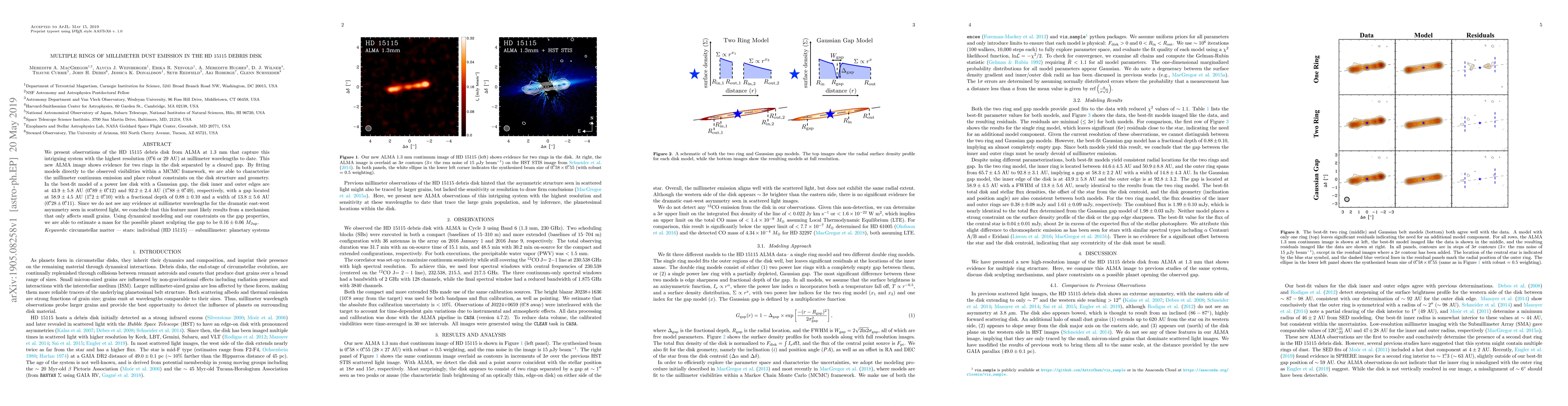We present observations of the HD 15115 debris disk from ALMA at 1.3 mm that capture this intriguing system with the highest resolution ($0.\!\!^{\prime\prime}6$ or $29$ AU) at millimeter wavelengths to date. This new ALMA image shows evidence for two rings in the disk separated by a cleared gap. By fitting models directly to the observed visibilities within a MCMC framework, we are able to characterize the millimeter continuum emission and place robust constraints on the disk structure and geometry. In the best-fit model of a power law disk with a Gaussian gap, the disk inner and outer edges are at $43.9\pm5.8$ AU ($0.\!\!^{\prime\prime}89\pm0.\!\!^{\prime\prime}12$) and $92.2\pm2.4$ AU ($1.\!\!^{\prime\prime}88\pm0.\!\!^{\prime\prime}49$), respectively, with a gap located at $58.9\pm4.5$~AU ($1.\!\!^{\prime\prime}2\pm0.\!\!^{\prime\prime}10$) with a fractional depth of $0.88\pm0.10$ and a width of $13.8\pm5.6$ AU ($0.\!\!^{\prime\prime}28\pm0.\!\!^{\prime\prime}11$). Since we do not see any evidence at millimeter wavelengths for the dramatic east-west asymmetry seen in scattered light, we conclude that this feature most likely results from a mechanism that only affects small grains. Using dynamical modeling and our constraints on the gap properties, we are able to estimate a mass for the possible planet sculpting the gap to be $0.16\pm0.06$ $M_\text{Jup}$.