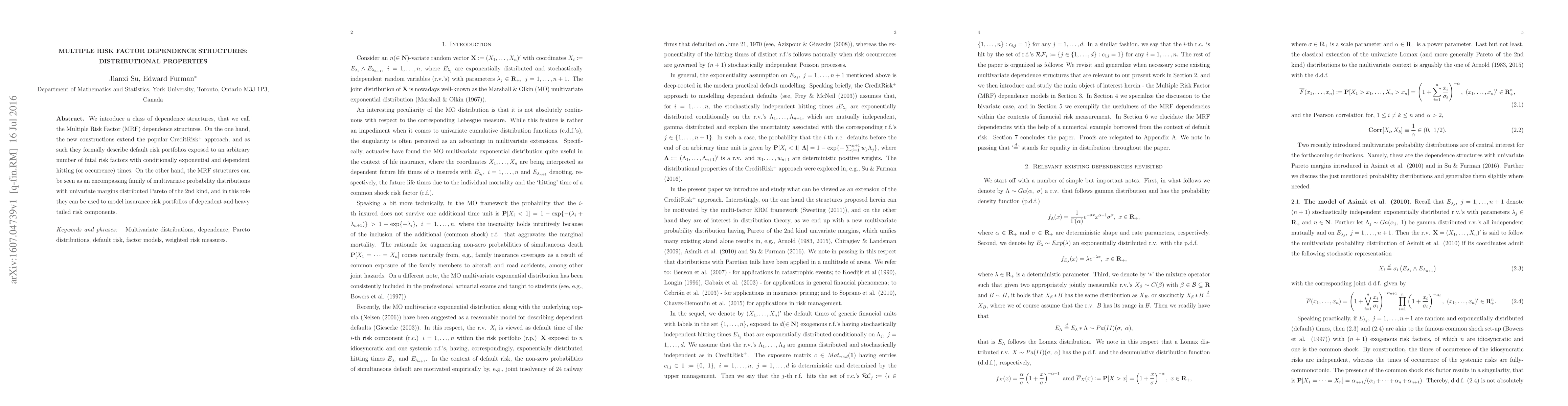 We introduce a class of dependence structures, that we call the Multiple Risk Factor (MRF) dependence structures. On the one hand, the new constructions extend the popular CreditRisk+ approach, and as such they formally describe default risk portfolios exposed to an arbitrary number of fatal risk factors with conditionally exponential and dependent hitting (or occurrence) times. On the other hand, the MRF structures can be seen as an encompassing family of multivariate probability distributions with univariate margins distributed Pareto of the 2nd kind, and in this role they can be used to model insurance risk portfolios of dependent and heavy tailed risk components.