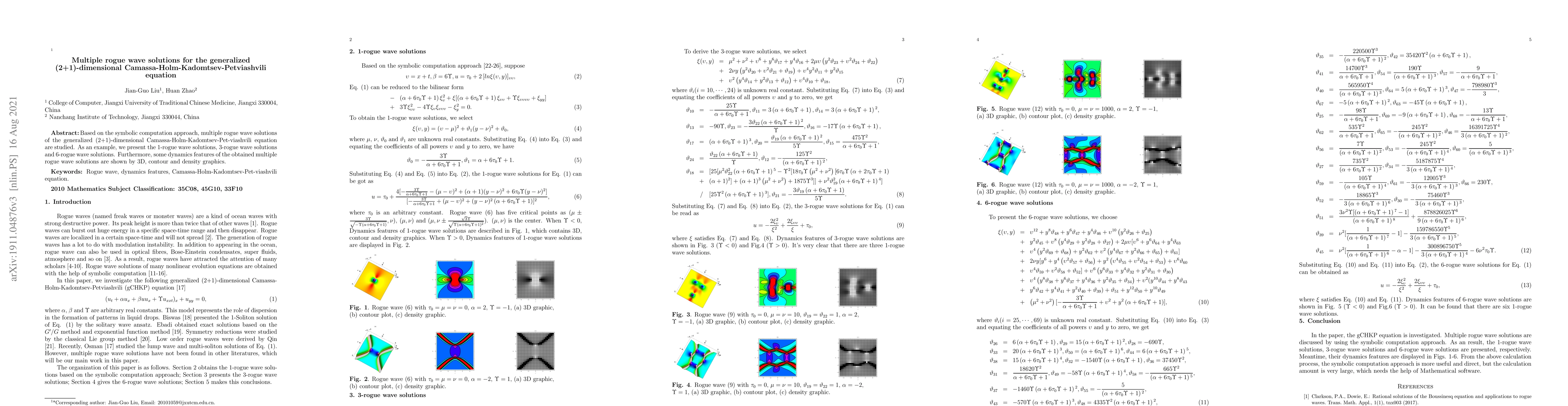This paper utilizes symbolic computation to explore multiple rogue wave solutions for the generalized (2+1)-dimensional Camassa-Holm-Kadomtsev-Petviashvili equation, presenting 1-rogue, 3-rogue, and 6-rogue wave solutions, and illustrating their dynamic features through 3D, contour, and density graphics.