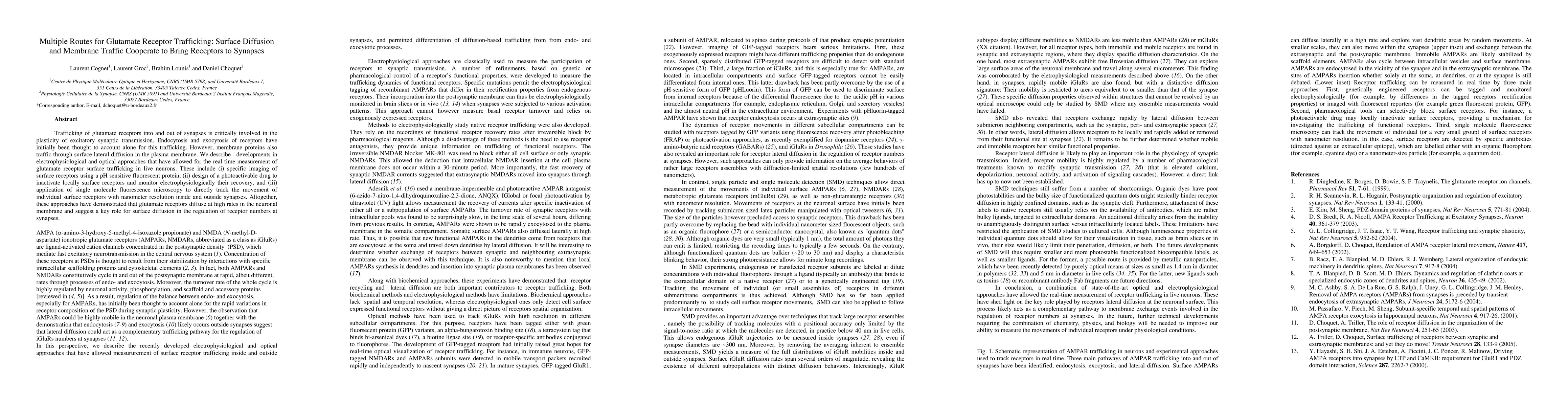 This paper explores the trafficking mechanisms of glutamate receptors, revealing that surface lateral diffusion is a significant contributor to their movement in live neurons. Advanced electrophysiological and optical techniques show high rates of receptor diffusion, emphasizing the role of surface diffusion in synaptic receptor regulation.