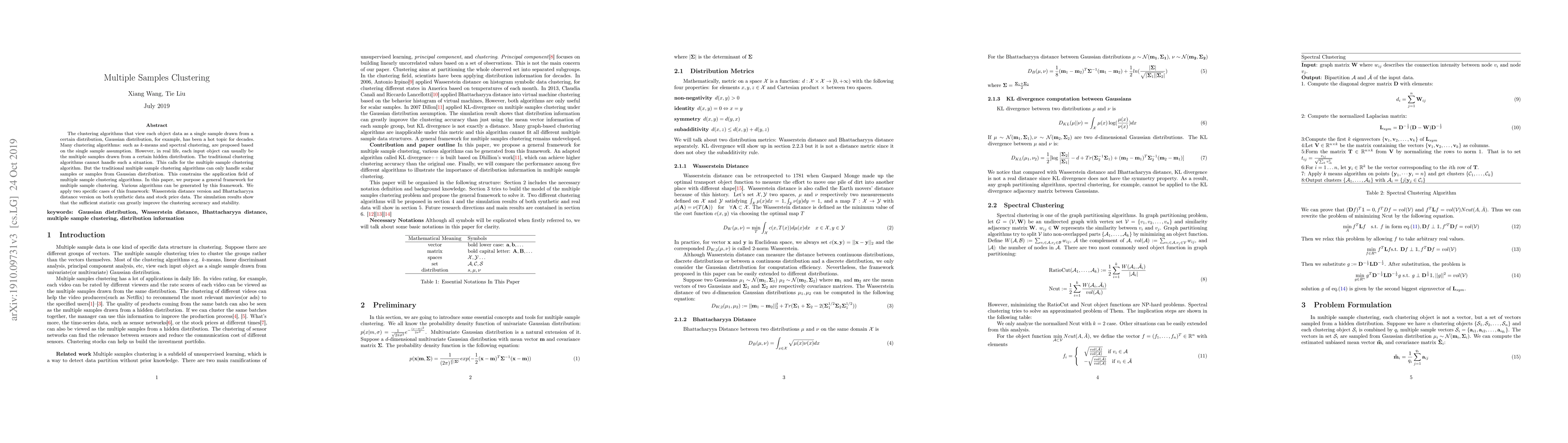 This paper proposes a general framework for multiple sample clustering, addressing the limitation of traditional algorithms that handle single samples or Gaussian distributions. The framework is demonstrated through two specific algorithms based on Wasserstein and Bhattacharyya distances, showing improved clustering accuracy and stability on synthetic and stock price data.