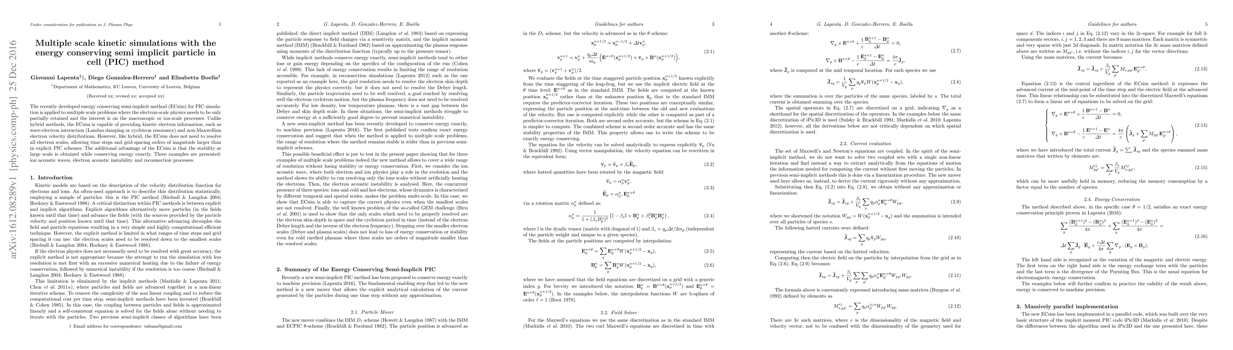 This paper applies the energy conserving semi-implicit method (ECsim) for particle-in-cell (PIC) simulations to multiple scale problems, focusing on macroscopic or ion-scale processes while partially retaining kinetic electron information. The ECsim method conserves energy exactly and allows for larger time steps and grid spacing compared to explicit PIC methods. Three examples demonstrating its application are ion acoustic waves, electron acoustic instability, and reconnection processes.