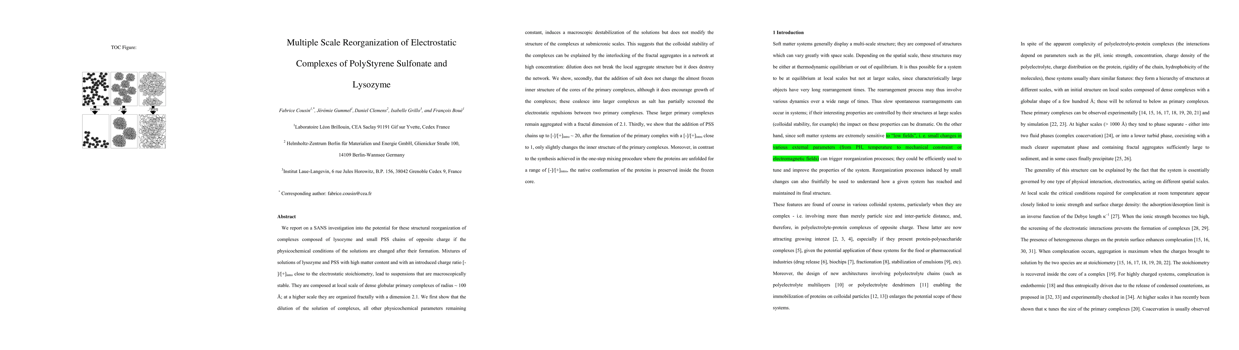 This study investigates the structural reorganization of electrostatic complexes formed by lysozyme and polystyrene sulfonate (PSS) under varying physicochemical conditions using SANS. The complexes maintain a fractal organization despite dilution, indicating colloidal stability from network interlocking. Salt addition promotes complex growth without altering the inner structure, while additional PSS preserves the native protein conformation.