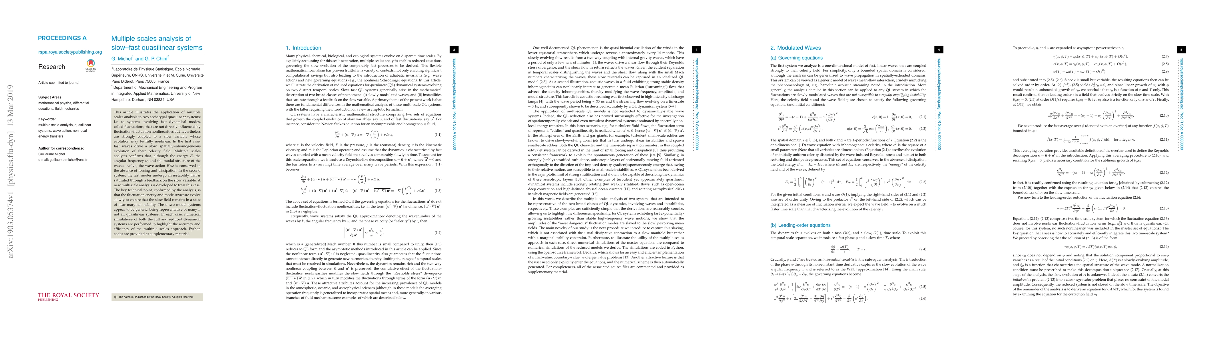 This paper applies multiple scales analysis to two quasilinear systems where fast dynamical modes are coupled to a slow variable, demonstrating conservation of wave action in the first system and the evolution of fluctuation energy in the second, where fast modes undergo instability. Numerical simulations validate the approach's accuracy and efficiency.