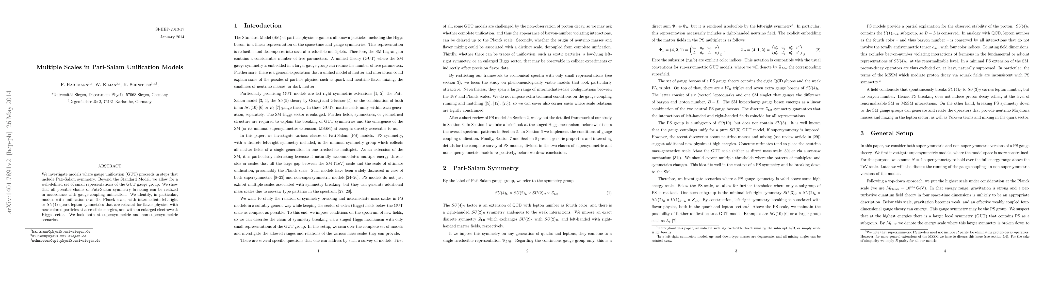 We investigate models where gauge unification (GUT) proceeds in steps that include Pati-Salam symmetry. Beyond the Standard Model, we allow for a well-defined set of small representations of the GUT gauge group. We show that all possible chains of Pati-Salam symmetry breaking can be realized in accordance with gauge-coupling unification. We identify, in particular, models with unification near the Planck scale, with intermediate left-right or SU(4) quark-lepton symmetries that are relevant for flavor physics, with new colored particles at accessible energies, and with an enlarged electroweak Higgs sector. We look both at supersymmetric and non-supersymmetric scenarios.