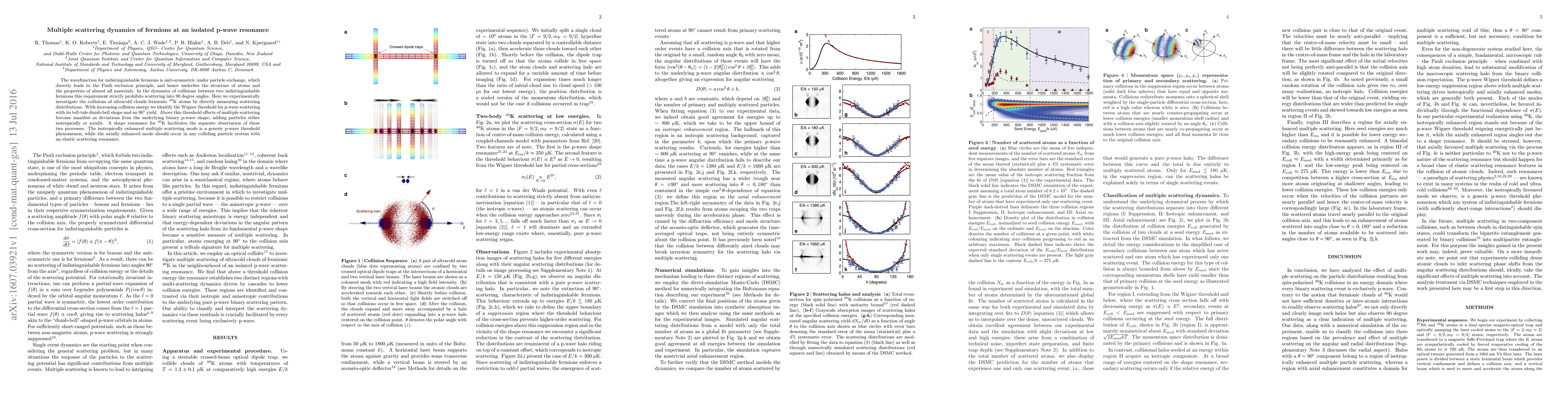 The wavefunction for indistinguishable fermions is anti-symmetric under particle exchange, which directly leads to the Pauli exclusion principle, and hence underlies the structure of atoms and the properties of almost all materials. In the dynamics of collisions between two indistinguishable fermions this requirement strictly prohibits scattering into 90 degree angles. Here we experimentally investigate the collisions of ultracold clouds fermionic $\rm^{40}K$ atoms by directly measuring scattering distributions. With increasing collision energy we identify the Wigner threshold for p-wave scattering with its tell-tale dumb-bell shape and no $90^\circ$ yield. Above this threshold effects of multiple scattering become manifest as deviations from the underlying binary p-wave shape, adding particles either isotropically or axially. A shape resonance for $\rm^{40}K$ facilitates the separate observation of these two processes. The isotropically enhanced multiple scattering mode is a generic p-wave threshold phenomenon, while the axially enhanced mode should occur in any colliding particle system with an elastic scattering resonance.