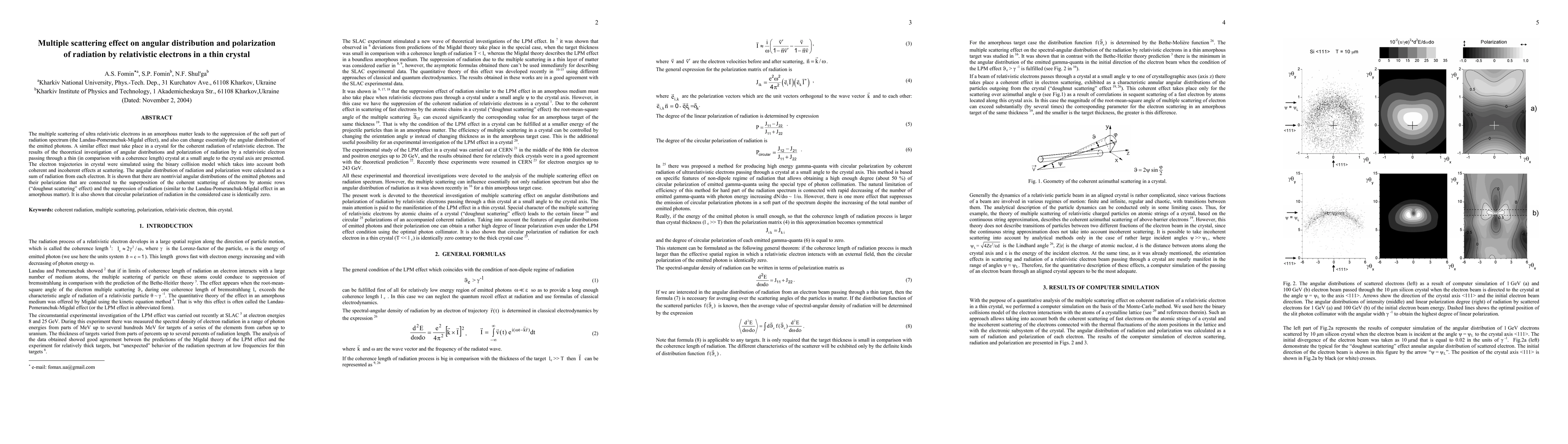 This paper investigates the multiple scattering effects on the angular distribution and polarization of radiation emitted by relativistic electrons passing through a thin crystal. The study reveals nontrivial angular distributions and polarization patterns due to coherent scattering and radiation suppression effects, with no circular polarization observed.