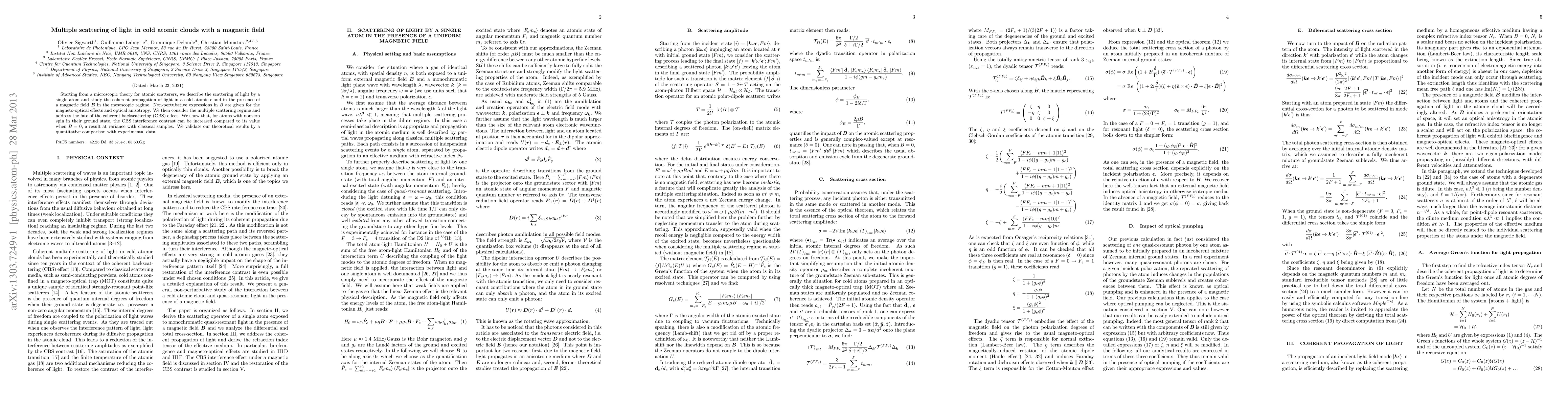 This paper investigates the scattering of light in cold atomic clouds under a magnetic field, deriving non-perturbative expressions for magneto-optical effects and optical anisotropy. It finds that the coherent backscattering effect can be enhanced in atomic clouds with nonzero spin atoms, contrary to classical samples, and validates these findings with experimental data.