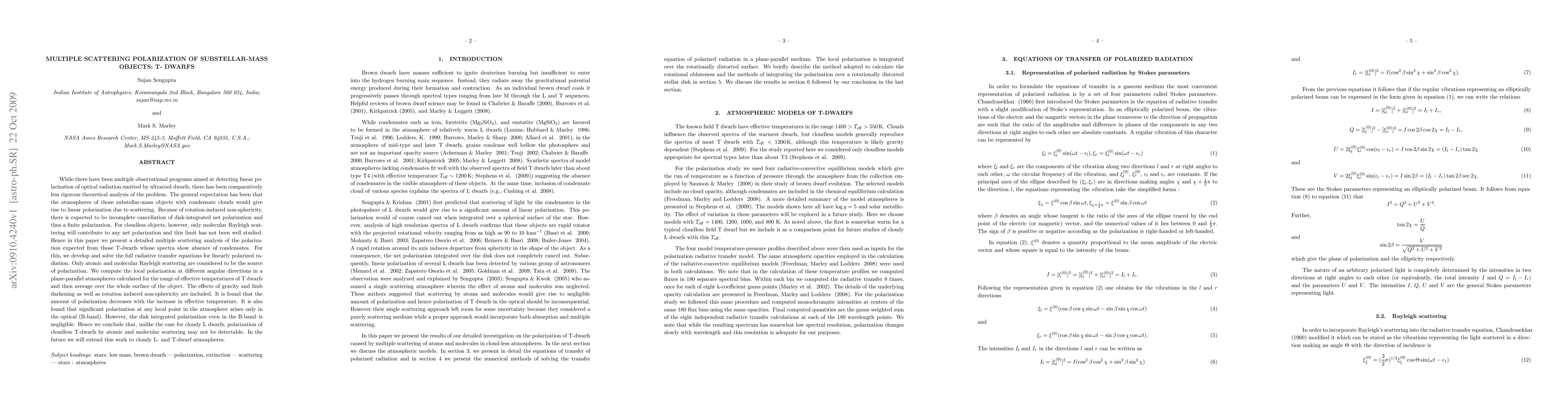 This paper conducts a detailed multiple scattering analysis to determine the polarization of optical radiation from T-dwarfs, which lack condensate clouds. It finds that while local polarization in the optical B-band is significant, the overall disk-integrated polarization remains negligible, concluding that polarization from atomic and molecular scattering in cloudless T-dwarfs is unlikely to be detectable.
